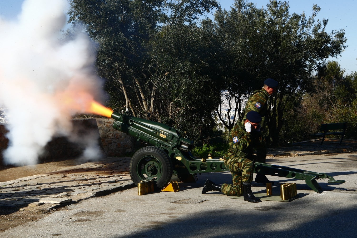 Ο πρώτος κανονιοβολισμός σημειώθηκε στις 6:21 το πρωί, από το πυροβολείο του Λυκαβηττού για να αντηχήσουν ακολούθως άλλοι 20 κανονιοβολισμοί, όπως προβλέπει το καθιερωμένο πρωτόκολλο.