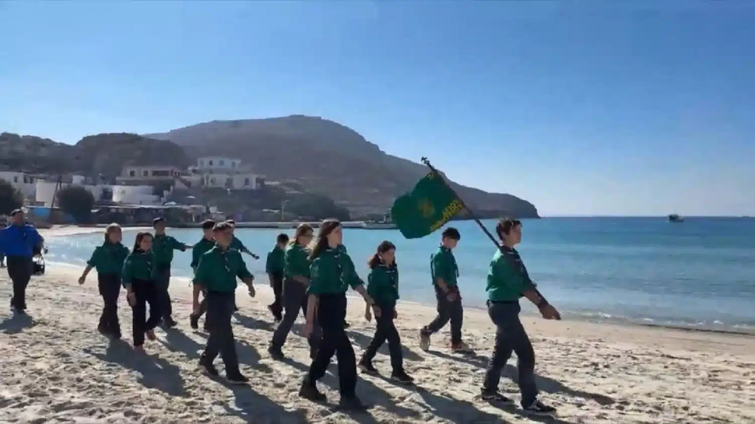 Τα τέσσερα παιδιά κράτησαν μία ελληνική σημαία και συνοδεία εκπαιδευτικών και γονιών που τα κρατούσαν από τα χέρια, παρέλασαν στην αμμουδιά.