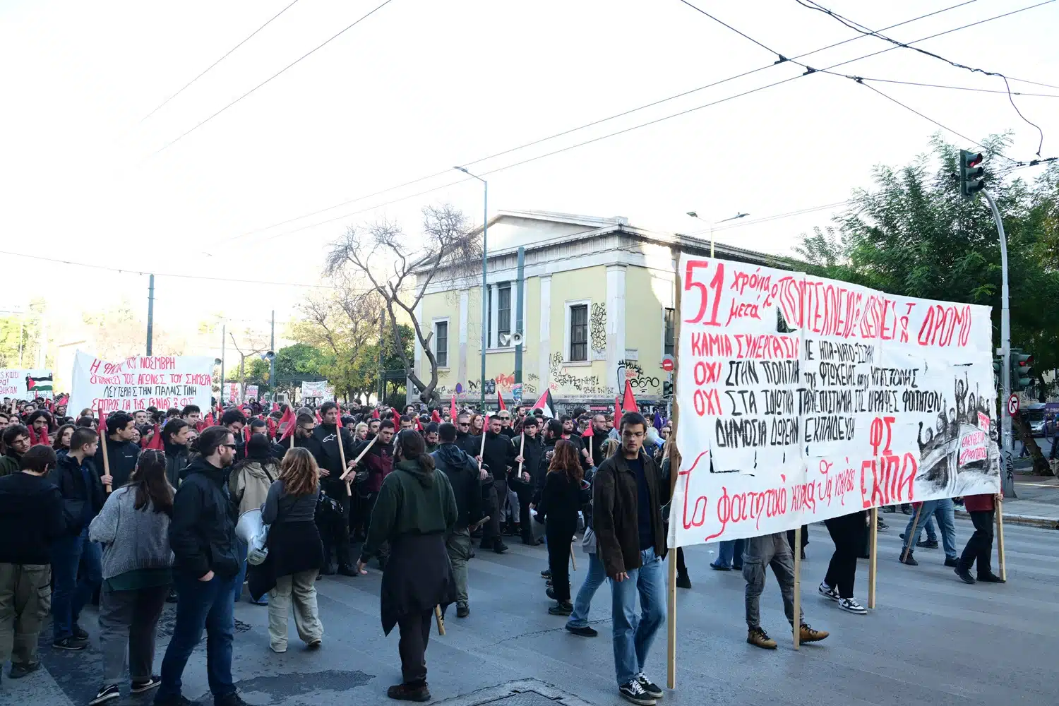 Νωρίτερα μέσα στην ημέρα, κρατώντας λουλούδια, ζωγραφιές, αλλά και ομπρέλες εξαιτίας της βροχής, πλήθος κόσμου έδωσε το «παρών» στο ιστορικό κτηριακό συγκρότημα του Πολυτεχνείου, στην οδό Πατησίων, ώστε να αποτίσουν φόρο τιμής στους φοιτητές που εξεγέρθηκαν τα ξημερώματα της 17ης Νοεμβρίου 1973.