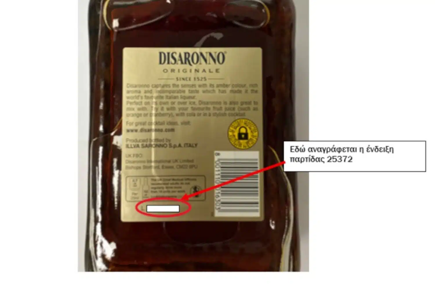 Πρόκειται για την παρτίδα 25372 του λικέρ «Disaronno».