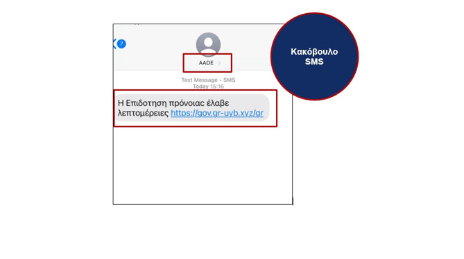 Συνεπώς, αγνοήστε οποιοδήποτε τέτοιο μήνυμα λάβατε ή τυχόν λάβετε στο κινητό σας τηλέφωνο χωρίς να έχετε εσείς υποβάλει προηγουμένως σχετικό αίτημα στην ΑΑΔΕ και ΜΗΝ πατήσετε τον οποιοδήποτε σύνδεσμο (url link).
