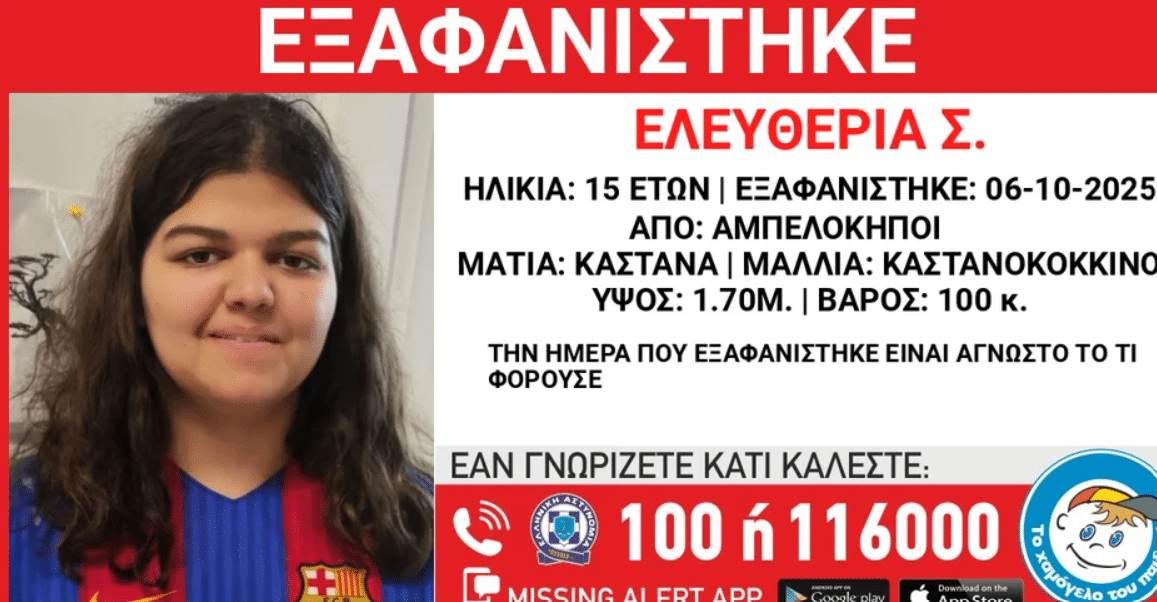 Στην ανακοίνωση που έδωσε στη δημοσιότητα το «Χαμόγελο του Παιδιού» για την εξαφάνιση, η 15χρονη Ελευθερία Σ., αγνοείται από τις 6 Οκτωβρίου από νοσοκομείο των Αμπελοκήπων.