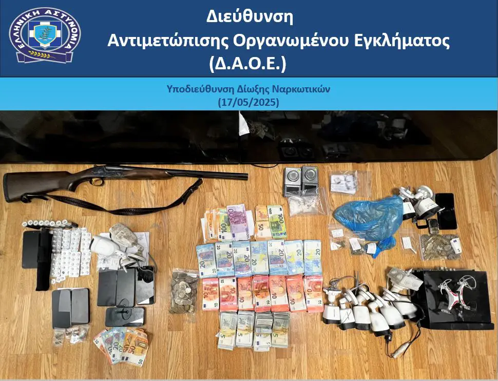 Κατασχέθηκαν ποσότητες κοκαΐνης και κάνναβης, φαρμακευτικά δισκία, πάνω από -32.500- ευρώ, κυνηγετικό δίκαννο και drone.