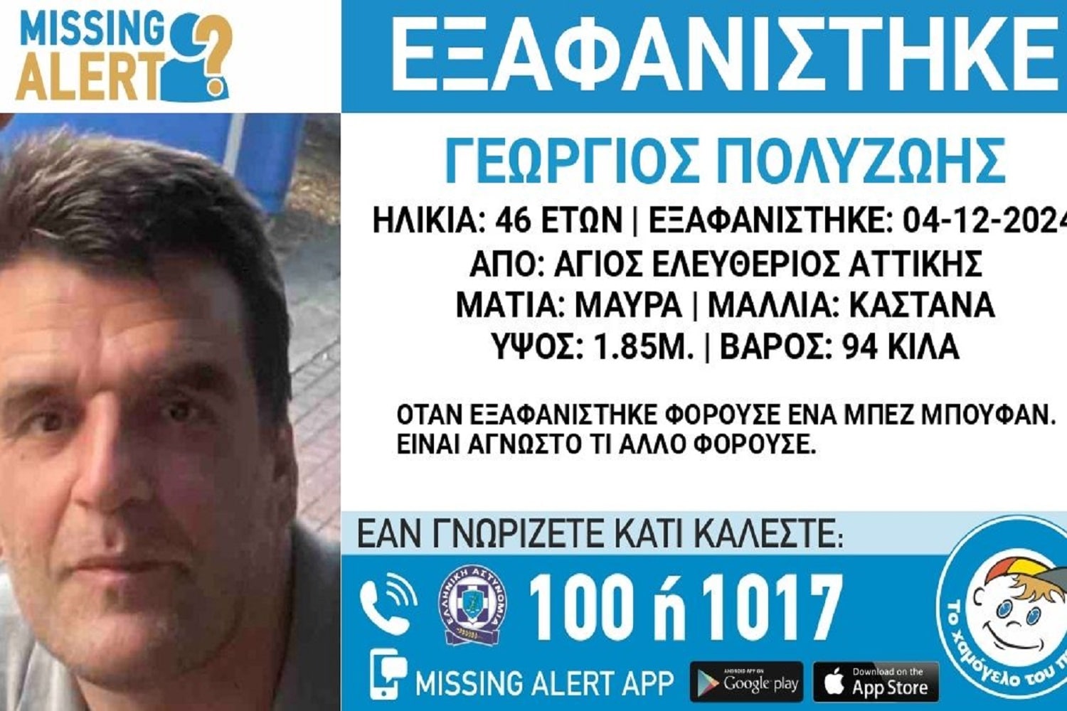 Συγκεκριμένα, σύμφωνα με την ανακοίνωση από «Το Χαμόγελο του Παιδιού» πρόκειται για 46χρονο με ύψος 1,85 μ., βάρος 94 κιλά, καστανά μαλλιά και μαύρα μάτια. Την ημέρα που εξαφανίστηκε φορούσε ένα μπεζ μπουφάν.