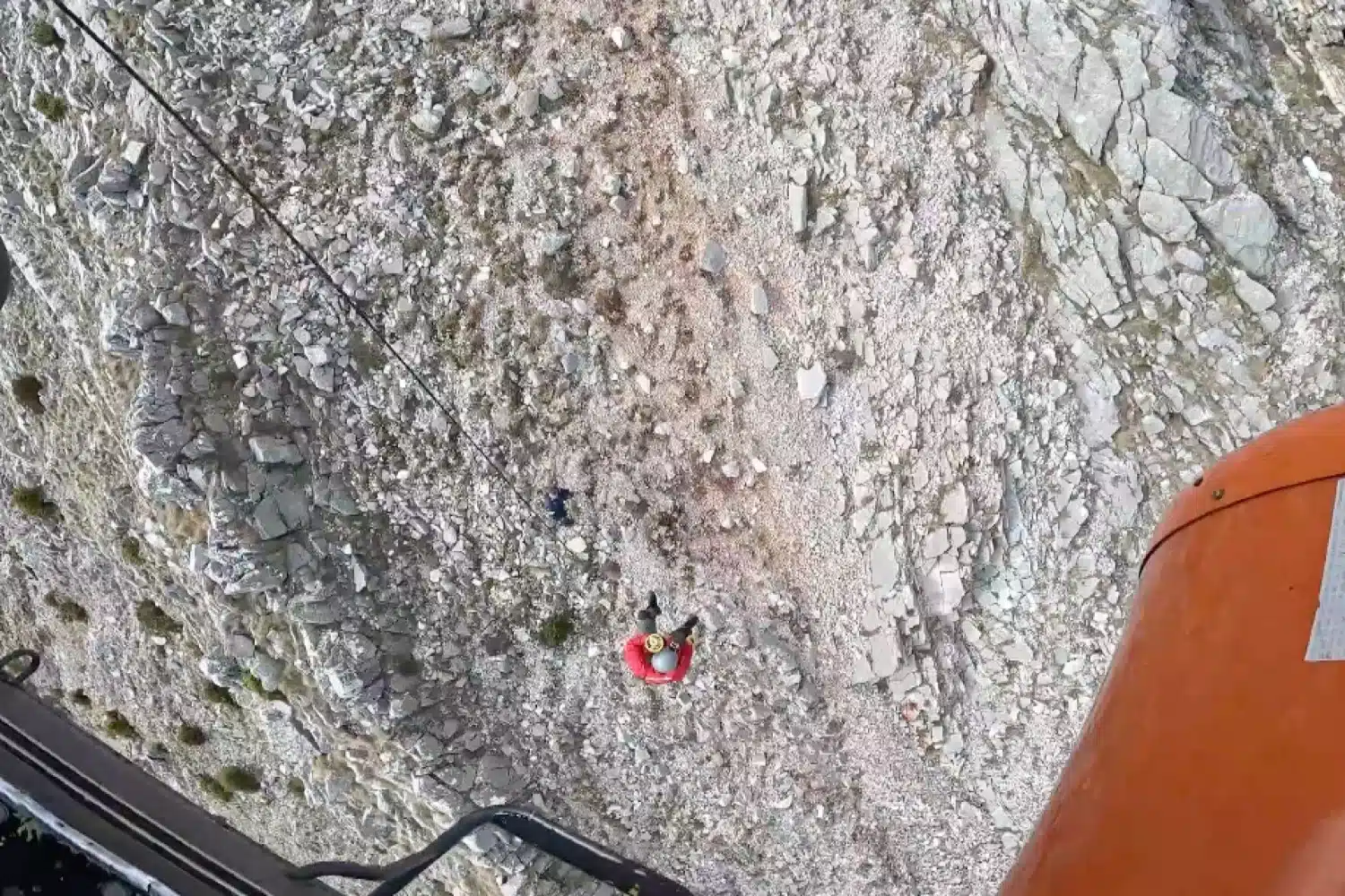 Όταν το Super Puma πλησιάζει το σημείο, ένας διασώστης κατεβαίνει με σχοινί στην πλαγιά και μαζί με τους πυροσβέστες τοποθετούν τον ορειβάτη σε φορείο και στη συνέχεια τον ανεβάζουν στο ελικόπτερο.
