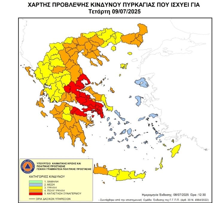 Σύμφωνα με το Χάρτη Πρόβλεψης Κινδύνου Πυρκαγιάς που εκδίδει η Γενική Γραμματεία Πολιτικής Προστασίας του Υπουργείου Κλιματικής Κρίσης & Πολιτικής Προστασίας (civilprotection.gov.gr), για αύριο Τετάρτη 09 Ιουλίου 2025, προβλέπεται: