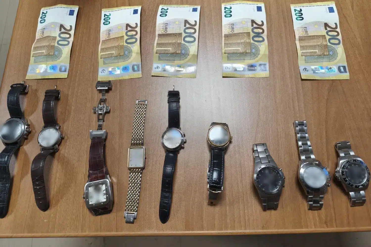 Από τους αστυνομικούς εντοπίστηκε μία συσκευασία, επιμελώς κρυμμένη στη βάση ελαιόδεντρου σε αγροτεμάχιο περιοχής της Άμφισσας, εντός της οποίας βρέθηκαν & κατασχέθηκαν συνολικά εννέα κλεμμένα ρολόγια, τα οποία αποδόθηκαν στον νόμιμο κάτοχό τους, καθώς και το χρηματικό ποσό των 1.000 ευρώ, προερχόμενο από την πώληση ενός ακόμη κλεμμένου ρολογιού σε περιοχή της Αττικής.