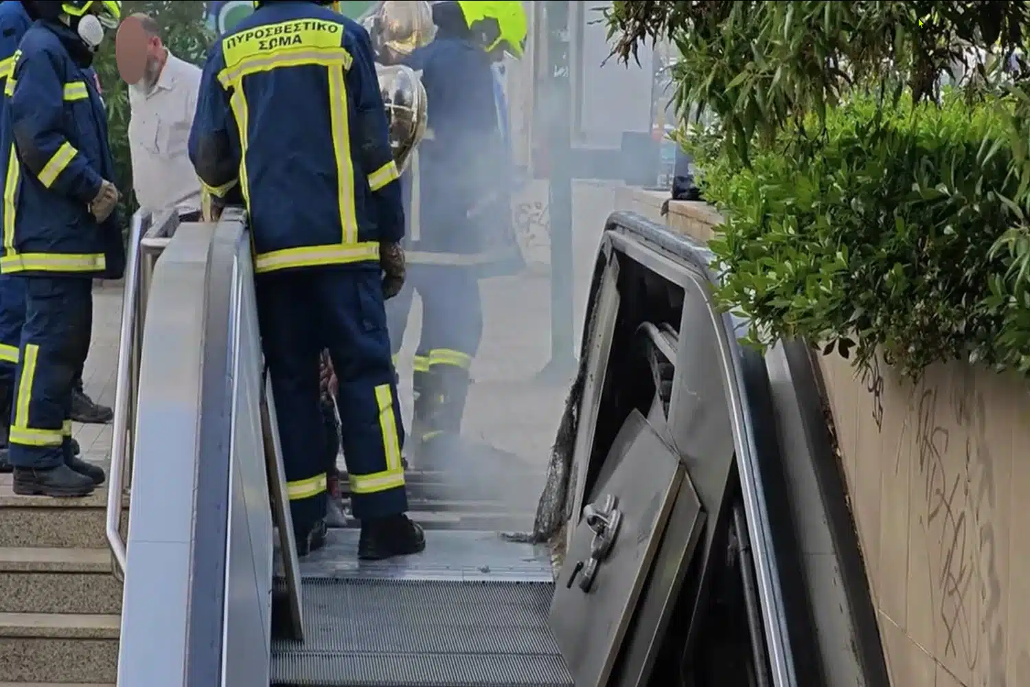 Στο σημείο έσπευσαν πυροσβέστες με δυο οχήματα, οι οποίοι διαπίστωσαν ότι πράγματι εκλύονταν καπνοί από την κυλιόμενη σκάλα από την πλευρά της εισόδου στη Σούτσου. Ακολούθησαν ενέργειες για να βρουν την πηγή της φωτιάς που φάνηκε να είναι βαθιά μέσα στον μηχανισμό της σκάλας.