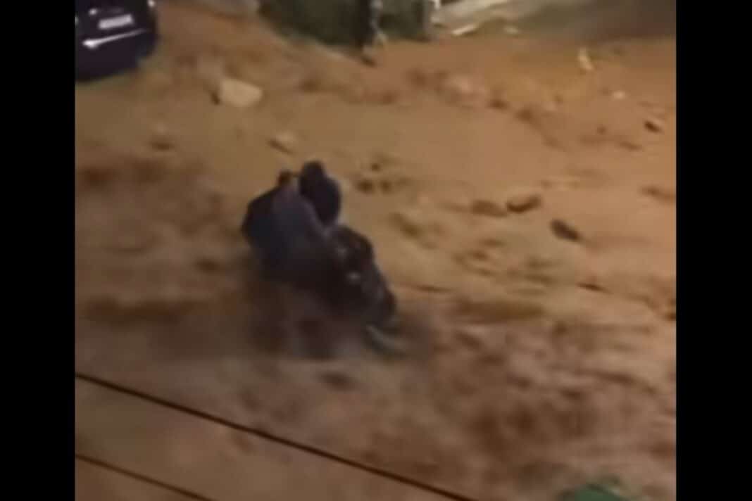 Σύμφωνα με μαρτυρίες και βίντεο που κυκλοφορούν, η γυναίκα επιχείρησε να διασχίσει πεζή δρόμο που είχε μετατραπεί σε χείμαρρο.