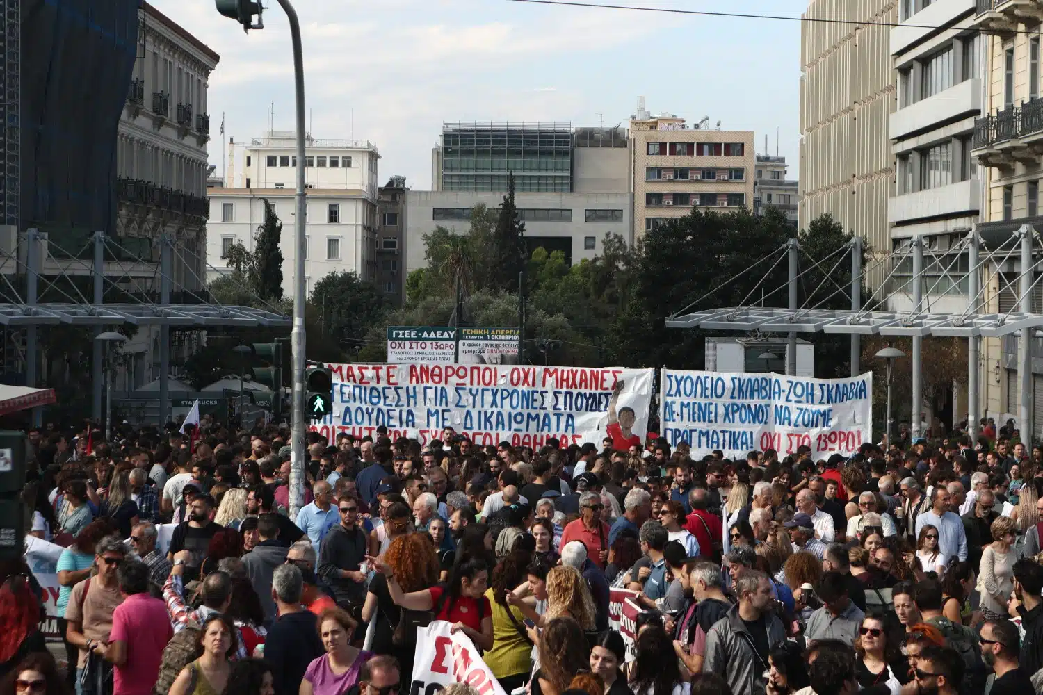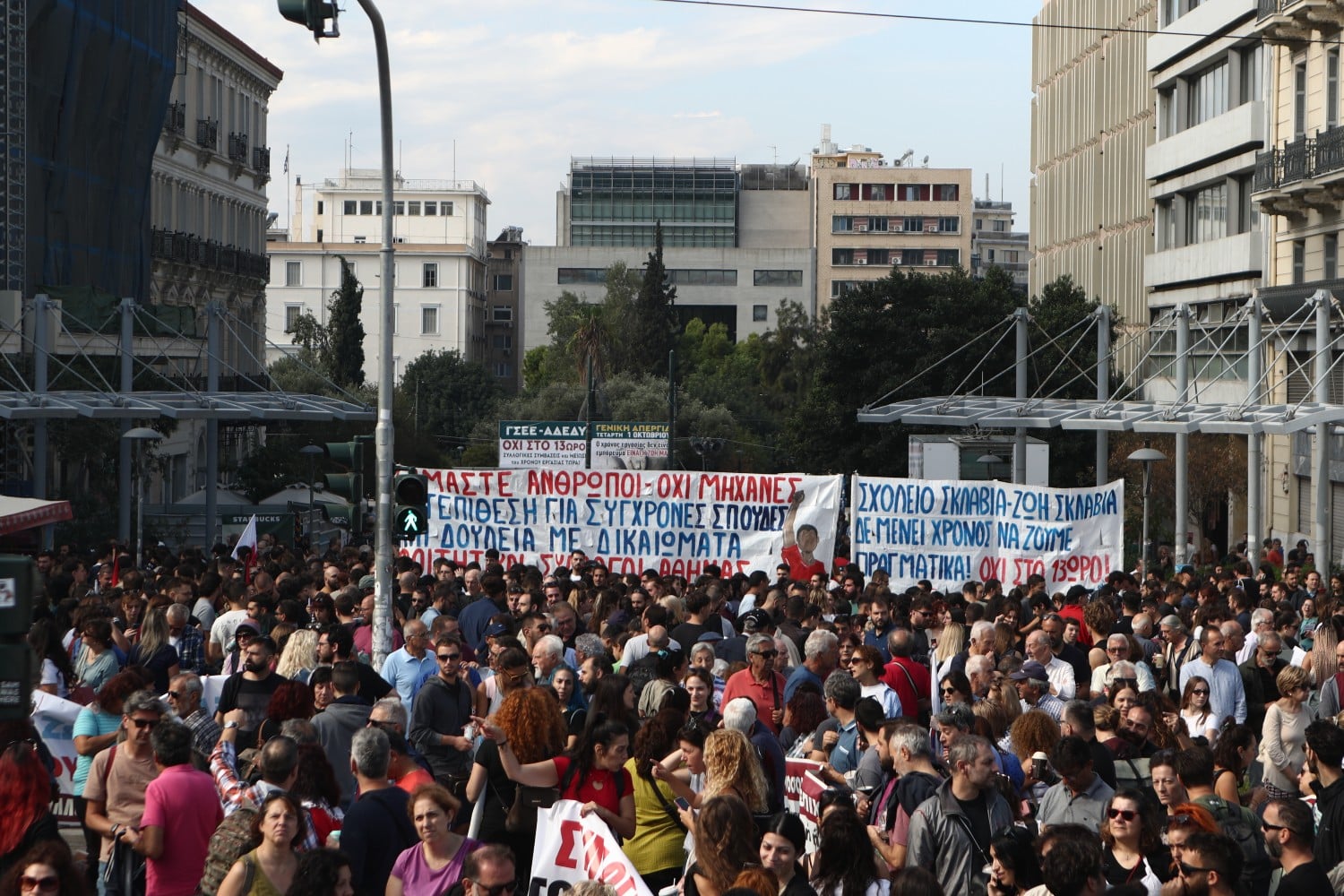 Τα συλλαλητήρια για την απεργία διοργανώνουν οι ΓΣΕΕ–ΑΔΕΔΥ–ΕΚΑ στην πλατεία Κλαυθμώνος και το ΠΑΜΕ στα Προπύλαια και το κέντρο της Αθήνας αρχίζει να γεμίζει.