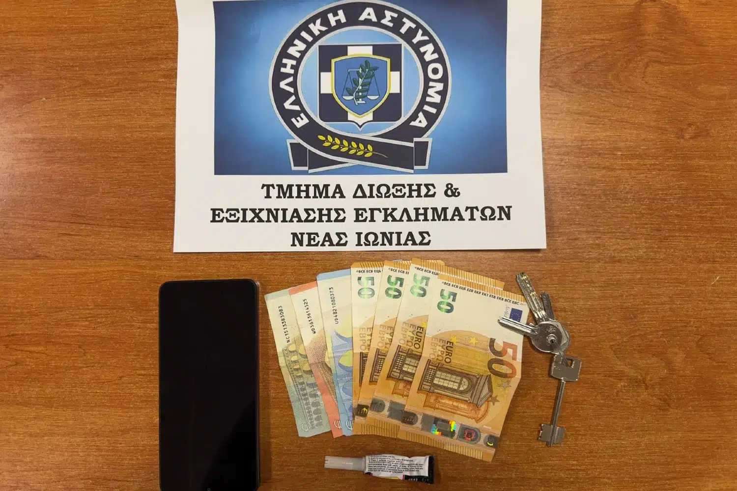 Στην κατοχή του βρέθηκαν και κατασχέθηκαν, συσκευή κινητού τηλεφώνου, συσκευασία κόλλας, κλειδιά και χρηματικό ποσό.