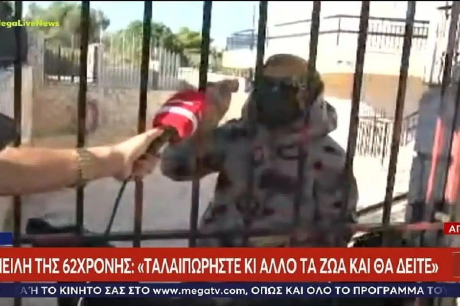 Σε ένα ντελίριο γαβγισμάτων από τα σκυλιά της 62χρονης στη Βοιωτία, η γυναίκα είπε στη δημοσιογράφο του Mega, που ήταν έξω από το σπίτι της: «Ταλαιπωρήστε κι άλλο τα σκυλιά, και θα δείτε τι θα πάθετε».