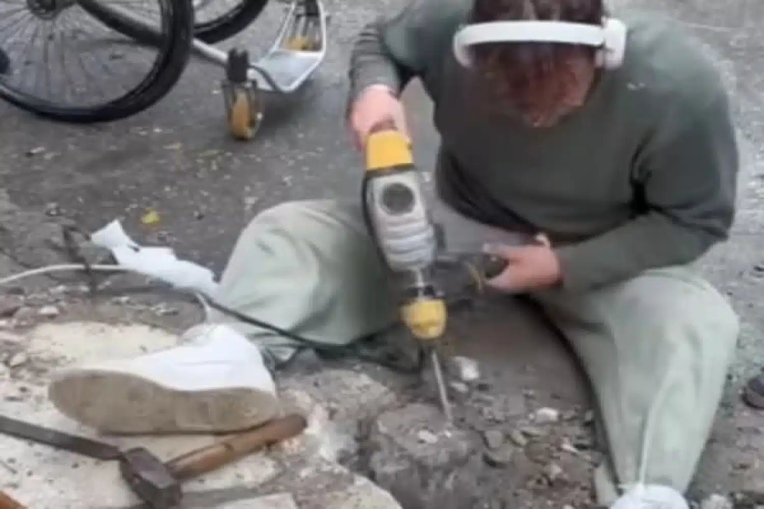 Με πείσμα και επιμονή, αφαίρεσε πέτρες, έφτιαξε μπετόν με τσιμέντο, άμμο και νερό, και άρχισε να απλώνει το υλικό για να δημιουργήσει μια πρόσβαση που δεν του είχε δοθεί ποτέ. Μούσκεμα από τη βροχή και ιδρωμένος από την προσπάθεια, δεν σταμάτησε λεπτό.