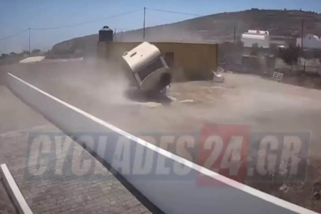 Το εντυπωσιακό αλλά και επικίνδυνο περιστατικό σημειώθηκε το μεσημέρι της Παρασκευής (27/6) στο Εμπορείο στη Σαντορίνη, όταν οι ισχυρές ριπές ανέμου σήκωσαν κυριολεκτικά από το έδαφος ένα τροχόσπιτο, παρασύροντάς το αρκετά μέτρα μακριά. Το όχημα περιστράφηκε γύρω από τον άξονά του, πριν καταλήξει πλήρως κατεστραμμένο σε διπλανό σημείο.