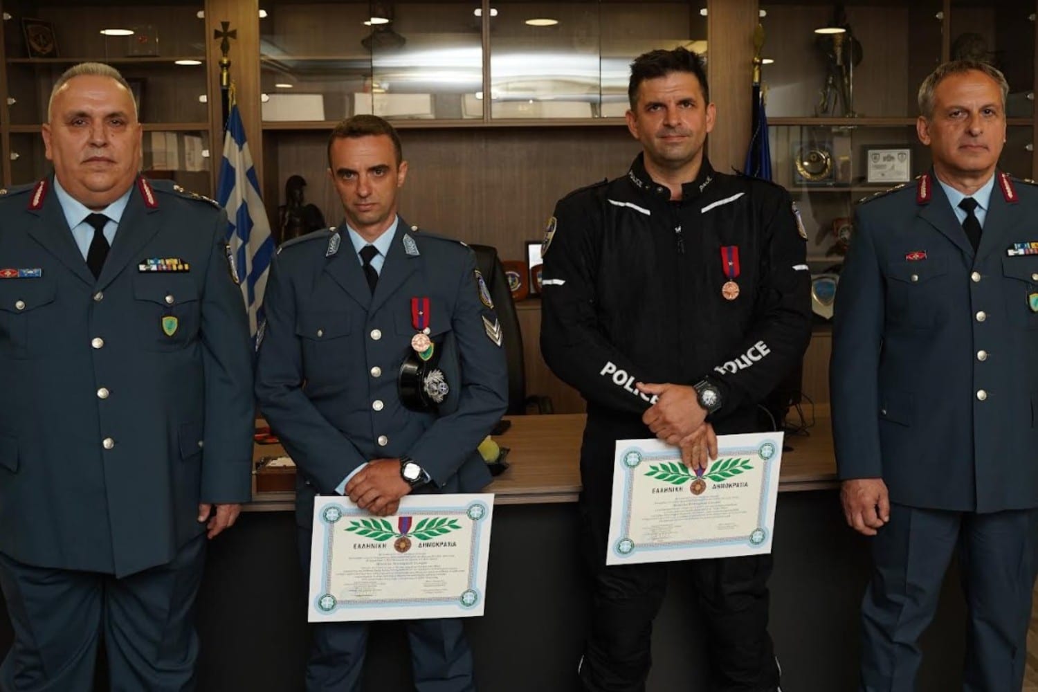 Σε ειδική τελετή που πραγματοποιήθηκε την Πέμπτη (5/6) στη Γενική Αστυνομική Διεύθυνση Αττικής, απονεμήθηκαν Αστυνομικά Μετάλλια με τα αντίστοιχα διπλώματα «Αστυνομικού Σταυρού» σε δύο αστυνομικούς της Διεύθυνσης Άμεσης Δράσης Αττικής/Ομάδα ΔΙ.ΑΣ., οι οποίοι σε κρίσιμες συνθήκες επέδειξαν θάρρος και αποφασιστικότητα, θέτοντας αποδεδειγμένα τη ζωή τους σε κίνδυνο.