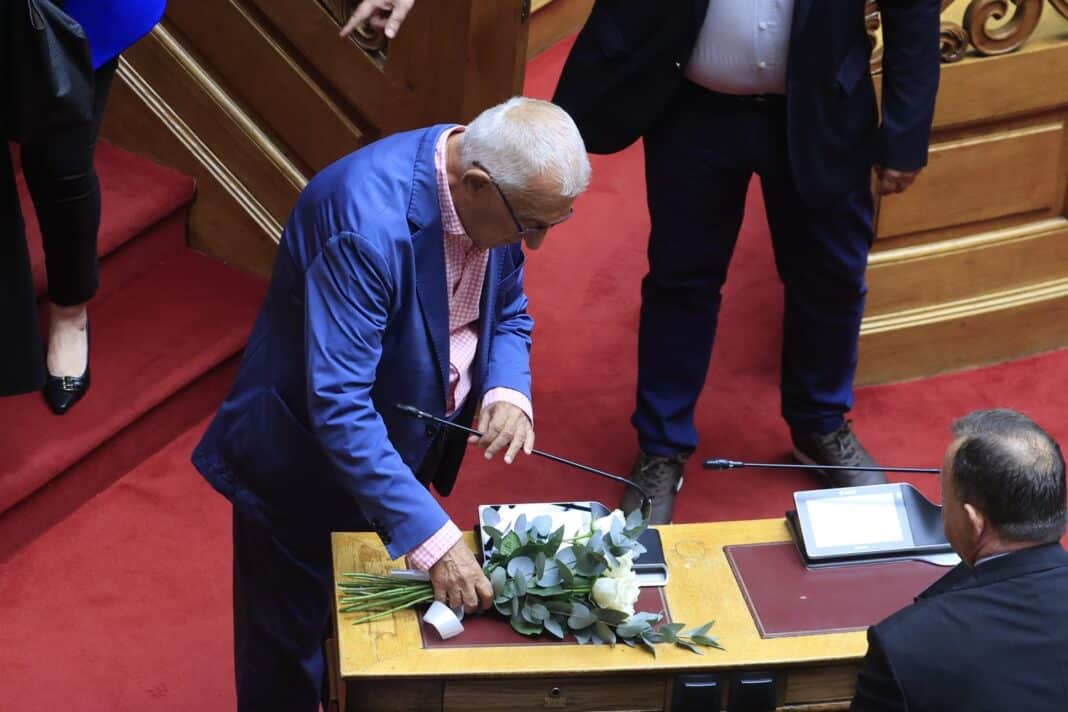 Με ένα μπουκέτο από λευκά τριαντάφυλλα στο έδρανό του και ενός λεπτού σιγής η Ολομέλεια της Βουλής τίμησε την μνήμη του πρώην γενικού γραμματέα της ΝΔ, πρώην υφυπουργού Οικονομικών και βουλευτή Ημαθίας Απόστολου Βεσυρόπουλου.