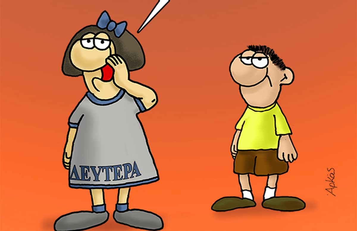 Στο σκίτσο αυτό βλέπουμε με μεγάλα κεφαλαία γράμματα τη λέξη «Καλημέρα» και μια γυναικά που αντιπροσωπεύει τη Δευτέρα να προσθέτει: «Όχι για όλους», ενώ δίπλα της υπάρχει ένα στεναχωρημένο αγοράκι.