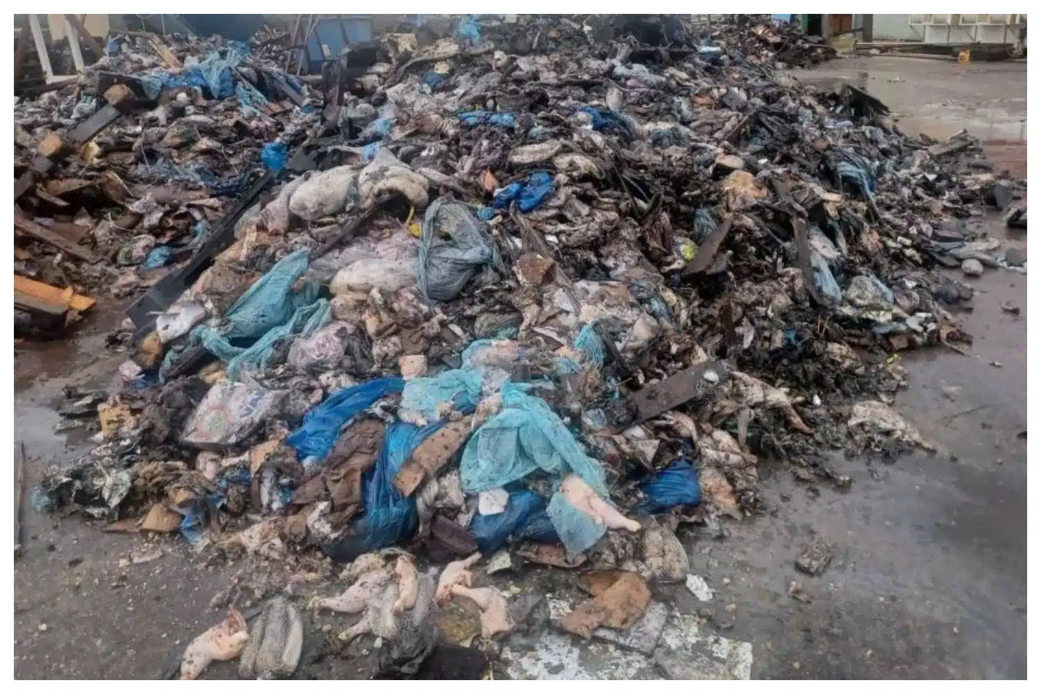 Επίσης, στους στεγασμένους χώρους, υφίστανται δύο μονάδες αδρανοποίησης και μία αποτέφρωσης που δεν λειτουργούσαν κατά την αυτοψία, ενώ βρέθηκαν αποτιθέμενοι σε σωρούς, τουλάχιστον 200 τόνοι, ανάμικτων Ζωικών Υποπροϊόντων (ΖΥΠ), συσκευασμένων – μεταποιημένων τροφίμων ζωικής προέλευσης σε αποσύνθεση, αναμεμιγμένων με Απόβλητα Εκσκαφών Κατασκευών και Κατεδαφίσεων (ΑΕΚΚ) και υλικών συσκευασίας τροφίμων.