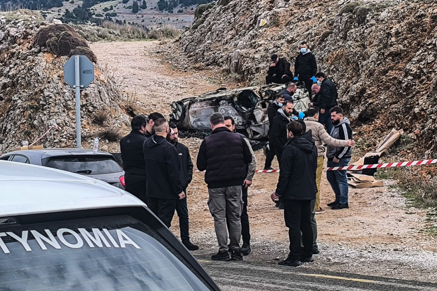Λίγη ώρα αργότερα, σε κοντινή απόσταση εντοπίστηκε καμένο όχημα, το οποίο θεωρείται το όχημα διαφυγής των δραστών. Οι Αρχές εκτιμούν ότι το εγκατέλειψαν και το πυρπόλησαν για να εξαφανίσουν ίχνη DNA και αποτυπωμάτων.