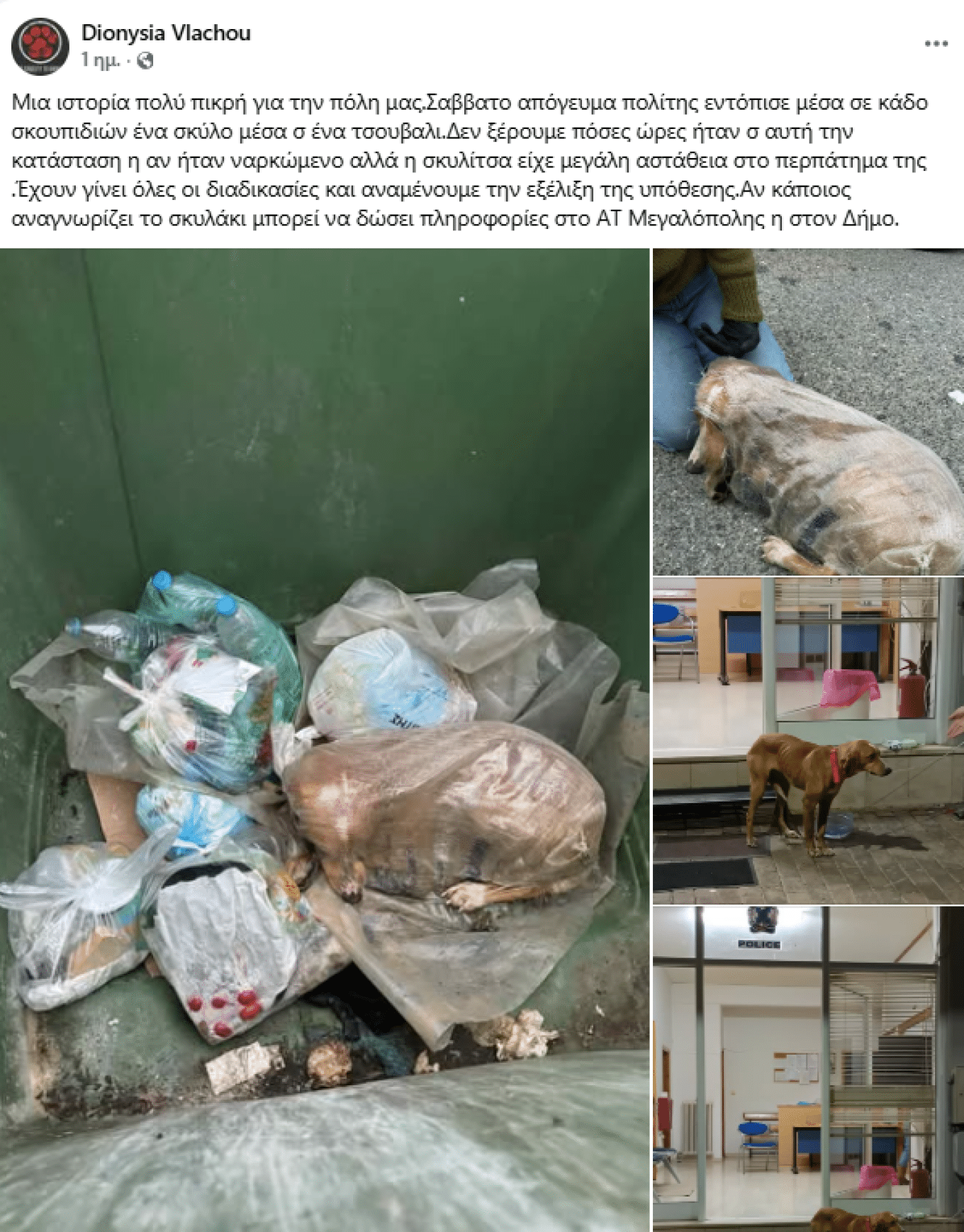 Έχουν γίνει όλες οι διαδικασίες και αναμένεται η εξέλιξη της υπόθεσης. Αν κάποιος γνωρίζει το σκυλάκι μπορεί να δώσει πληροφορίες στο ΑΤ Μεγαλόπολης ή στον Δήμο, σύμφωνα με ανακοίνωση στα μέσα κοινωνικής δικτύωσης.
