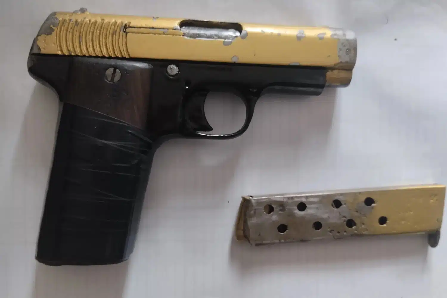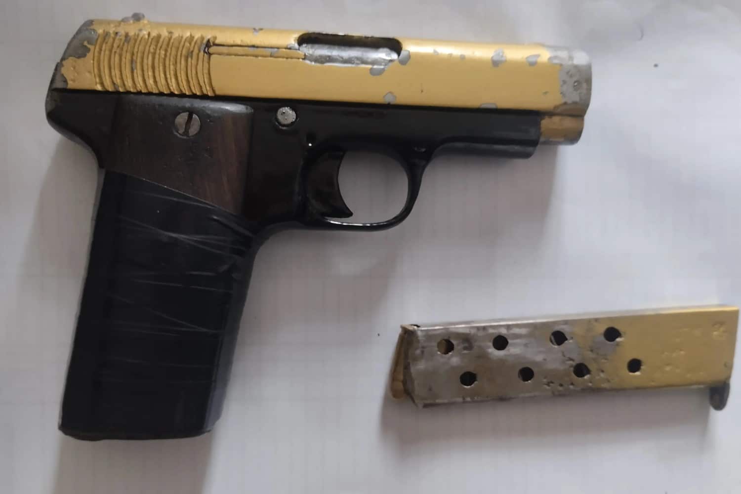 Κατά την έρευνα του αυτοκινήτου, βρέθηκε σε αποσκευές ενός εκ των παράτυπων μεταναστών και τυλιγμένο σε κουβέρτα, ένα πιστόλι, με γεμιστήρα και δύο φυσίγγια, τα οποία κατασχέθηκαν.