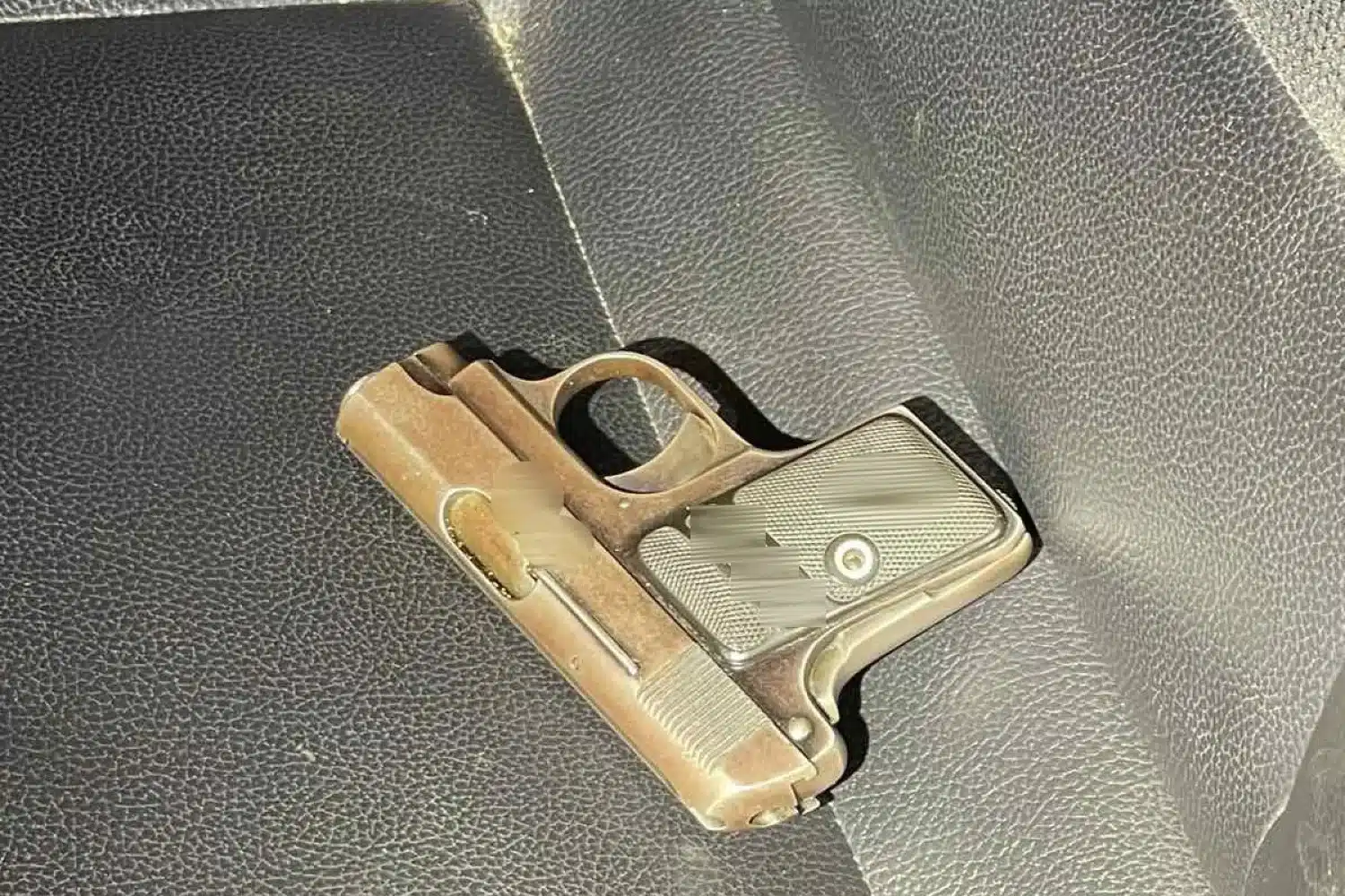 Εντός του οχήματος και συγκεκριμένα στο κάθισμα του οδηγού βρέθηκε και κατασχέθηκε πιστόλι με φυσίγγιο στη θαλάμη.