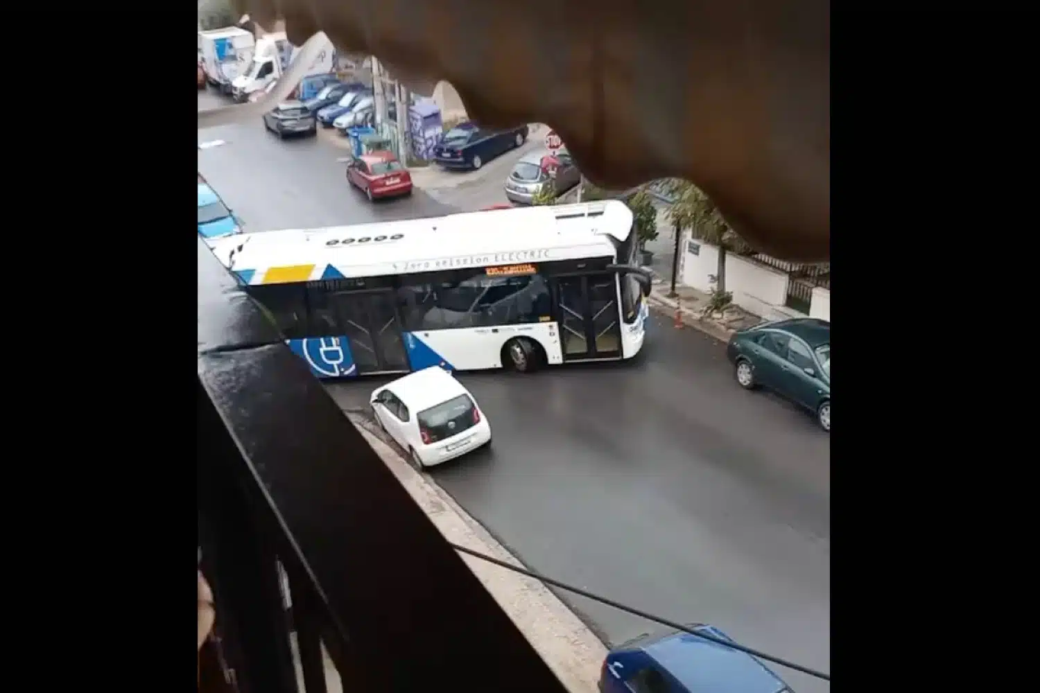 Στο βίντεο που ανέβασε κάτοικος της περιοχής, φαίνεται το λεωφορείο να έχει «κοκκαλώσει», μη μπορώντας να κάνει οποιαδήποτε κίνηση. Οι επιβάτες αναγκάζονται να εγκαταλείψουν το λεωφορείο και να το «πάρουν» με τα πόδια.