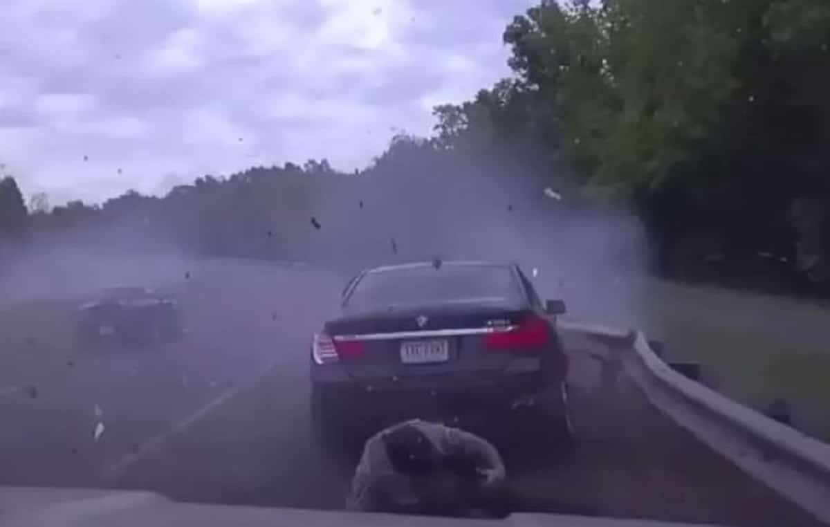 Την τρομακτική στιγμή που μια BMW χάνει τον έλεγχο, ενώ κινούνταν με 193 χλμ την ώρα σε εθνική οδό στη Βιρτζίνια με αποτέλεσμα να πέσει σε σταματημένο όχημα και να περάσει ξυστά από έναν αστυνομικό κατέγραψε κάμερα.