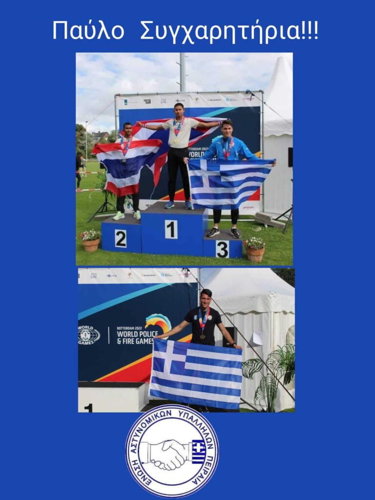 Το Διοικητικό Συμβούλιο της Ένωσης Αστυνομικών Υπαλλήλων Πειραιά, σε ανακοίνωσή του, «προβάλλει και συγχαίρει δημόσια το μέλος της Ένωσής μας, ΠΑΠΑΔΟΠΟΥΛΟ Παύλο διότι, συμμετείχε στους Παγκόσμιους αγώνες Αστυνομικών και Πυροσβεστών WPFG 2022, που διεξήχθησαν στο Ρότερνταμ Ολλανδίας και αγωνιζόμενος με την ομάδα της Αθλητικής Ένωσης Aστυνομικών Ελλάδος κατέκτησε 2 μετάλλια. Ένα Χάλκινο μετάλλιο, 3η Θέση στην απόσταση των 100 μέτρων και ένα Χάλκινο μετάλλιο – 3η θέση στην απόσταση των 200 μέτρων. Ως Ένωση, όπως έχουμε τονίσει και στο παρελθόν, δεσμευόμαστε να είμαστε δίπλα σε κάθε συνάδελφο μέλος μας αθλητή, όποτε και όπου χρειαστεί».