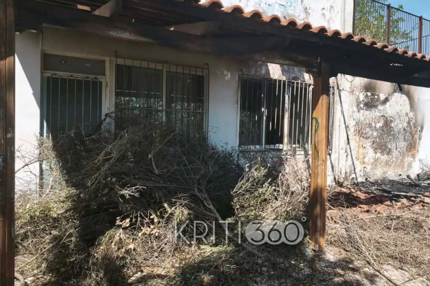 Από τη φωτιά καταστράφηκε η πέργκολα της αυλής, ενώ ζημιές υπέστη και τμήμα του προαυλίου χώρου, σύμφωνα με το kriti360.gr.