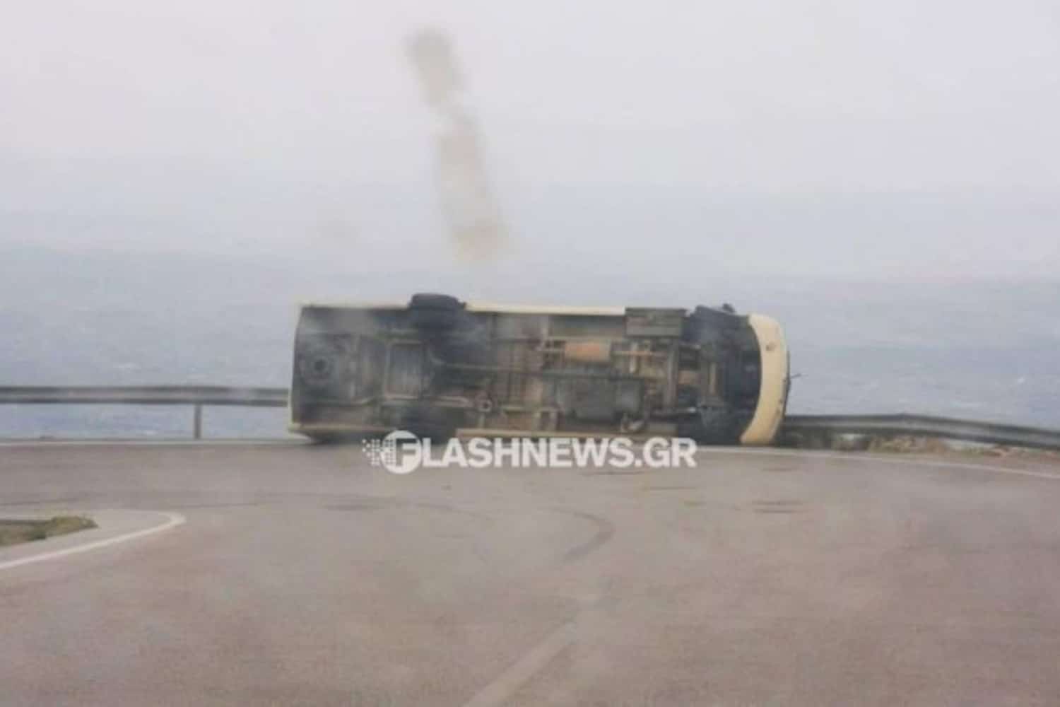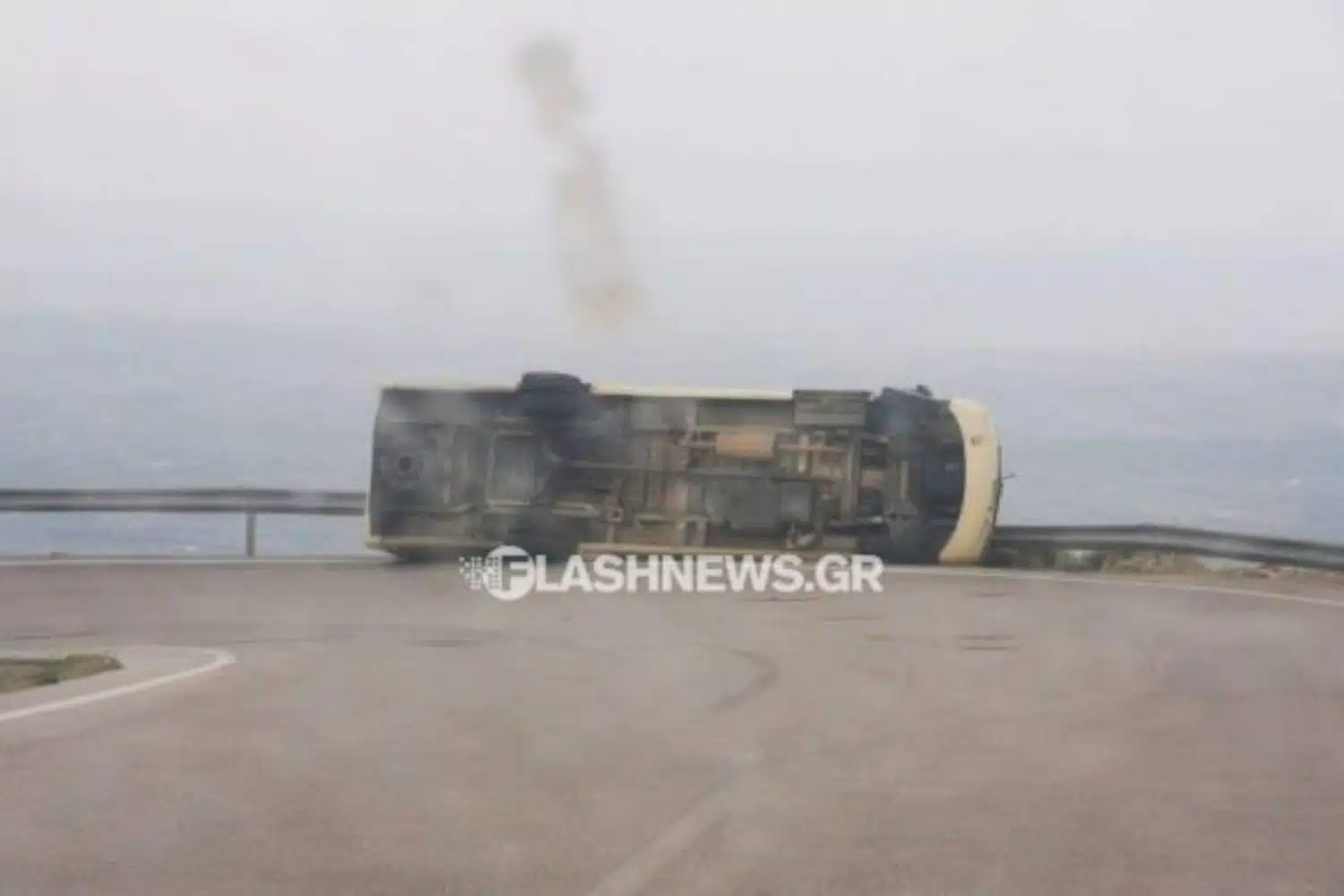 Το λεωφορείο ανατράπηκε και επισήμως δεν έχει αναφερθεί κάποιος τραυματισμός, ενώ και οι Αρχές ενημερώθηκαν το απόγευμα.