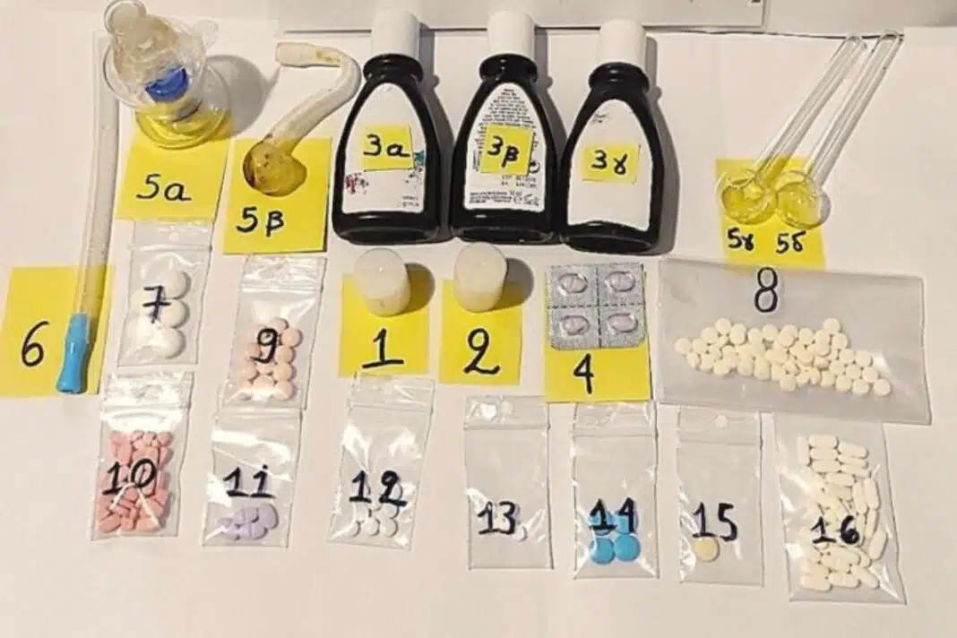 - Δύο (πλαστικά κυτία που περιείχαν κρυσταλλική μεθαμφεταμίνη συνολικού μικτού βάρους 7,7 γραμμαρίων,