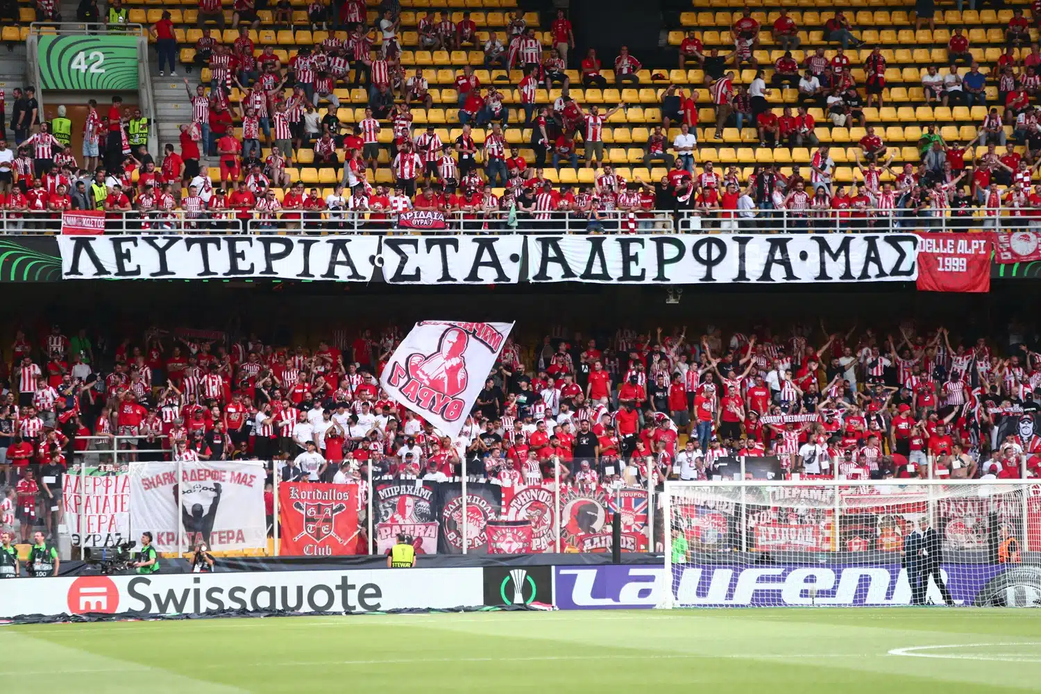 Στον τελικό του Conference League οι οπαδοί του Ολυμπιακού έδειξαν ξανά τη στήριξή τους στα μέλη της «Θύρας 7» που έχουν συλληφθεί για τη δολοφονία του αστυνομικού Γιώργου Λυγγερίδη.