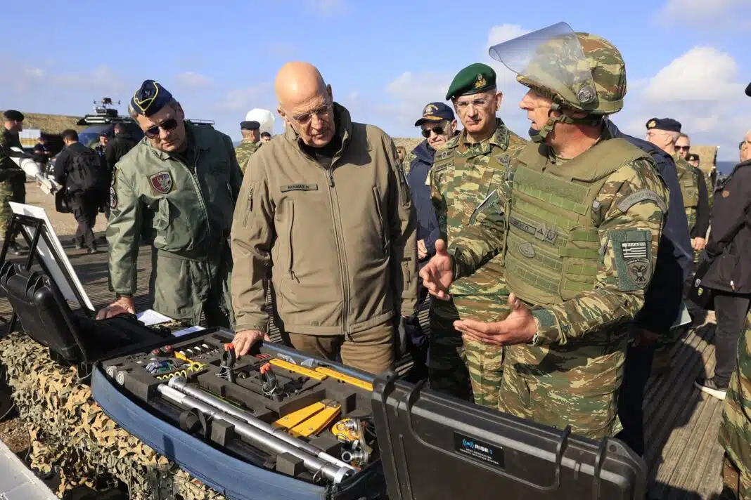 Ο υπουργός παρέστη στο πεδίο βολής «Αετός» όπου διεξάγεται η άσκηση «Αίσιος Οιωνός – 25» με τη συμμετοχή drone και anti-drone συστημάτων.