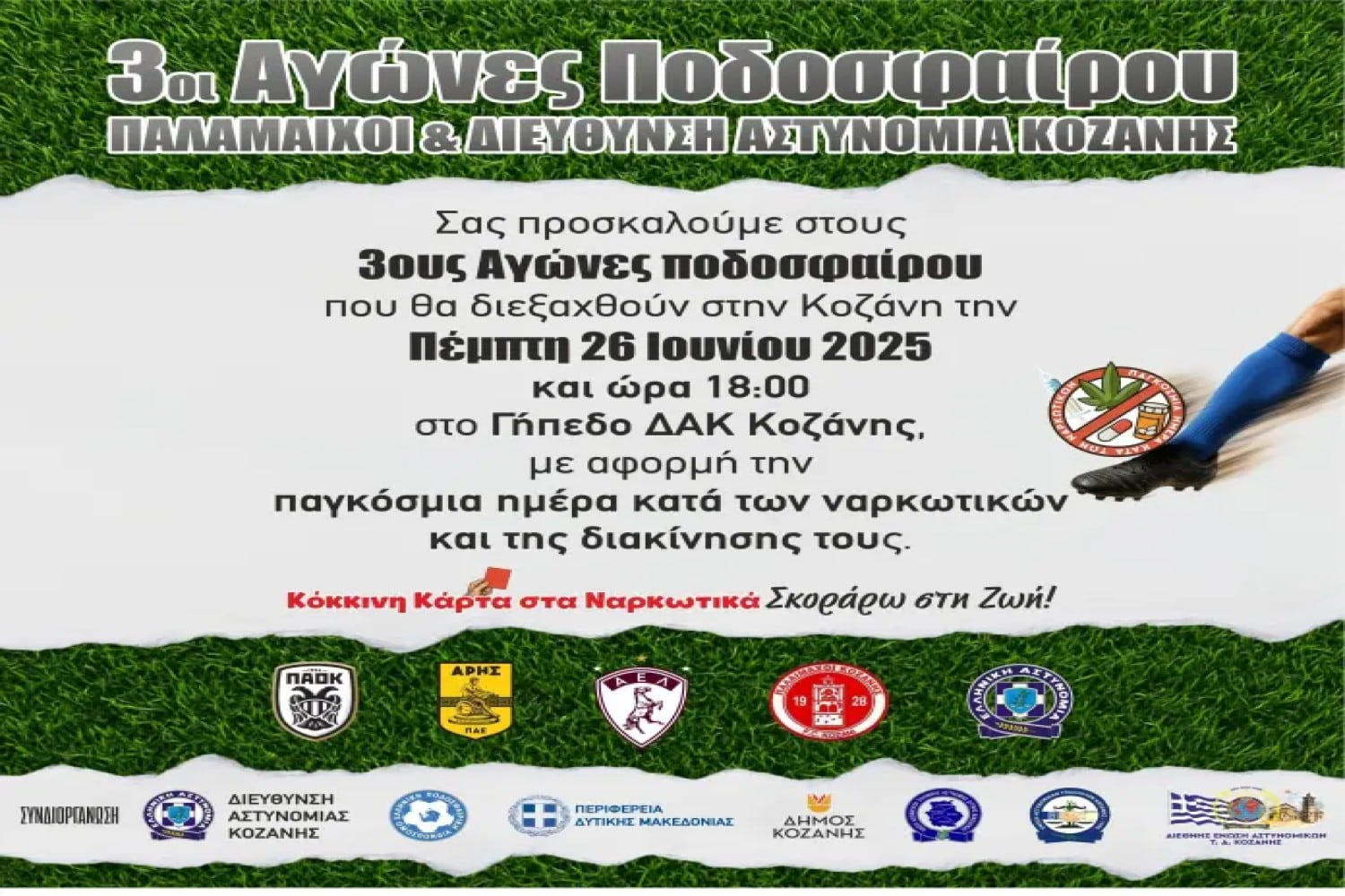 Με αφορμή την Παγκόσμια Ημέρα κατά των Ναρκωτικών και της Διακίνησης τους που είναι 26 Ιουνίου, η Διεύθυνση Αστυνομίας Κοζάνης για τρίτη συνεχή χρονιά, συνδιοργανώνει με την Ελληνική Ποδοσφαιρική Ομοσπονδία Περιφέρειας Δυτικής Μακεδονίας και Δήμου Κοζάνης, τις Ενώσεις Αξιωματικών Ελληνικής Αστυνομίας Δυτικής Μακεδονίας, Αστυνομικών Υπαλλήλων Νομού Κοζάνης και της Τοπικής Διοίκησης Κοζάνης (Ι.Ρ.Α) της Διεθνούς Ένωσης Αστυνομικών, Τουρνουά Ποδοσφαίρου, με κεντρικό μήνυμα «Κόκκινη κάρτα στα Ναρκωτικά .… Σκόραρω στη Ζωή» .