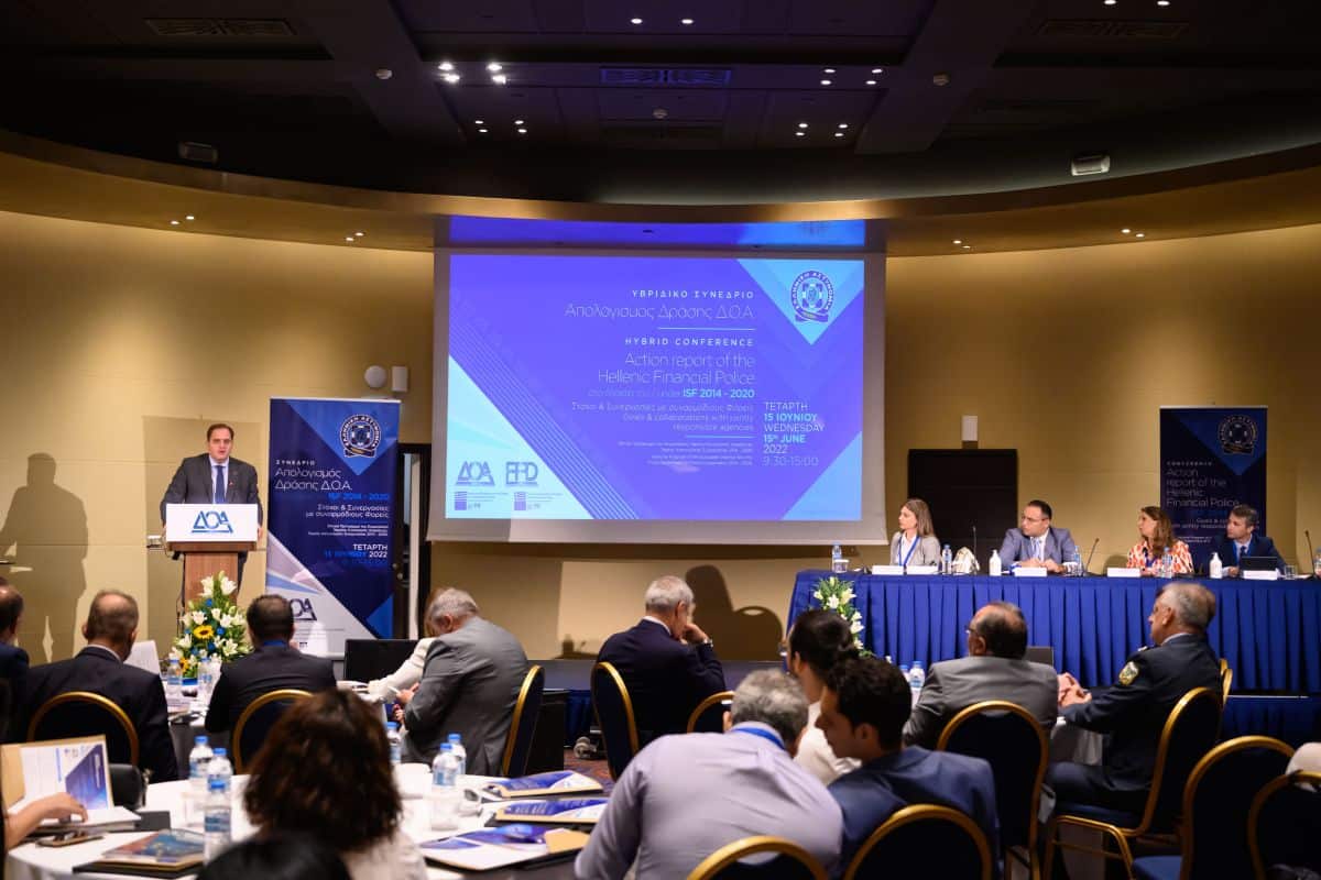 Απολογιστικό Συνέδριο της Διεύθυνσης Οικονομικής Αστυνομίας στο πλαίσιο υλοποίησης της Δράσης «Σύστημα Συλλογής, Ανάλυσης και Διαχείρισης Πληροφοριών Οικονομικού Εγκλήματος», του Εθνικού Προγράμματος, «Ευρωπαϊκό Ταμείο Εσωτερικής Ασφάλειας/Τομέας Αστυνομικής Συνεργασίας – ISF 2014-2020», πραγματοποιήθηκε χθες, Τετάρτη 15 Ιουνίου 2022, στην αίθουσα Zeus του Wyndham Grand Athens.