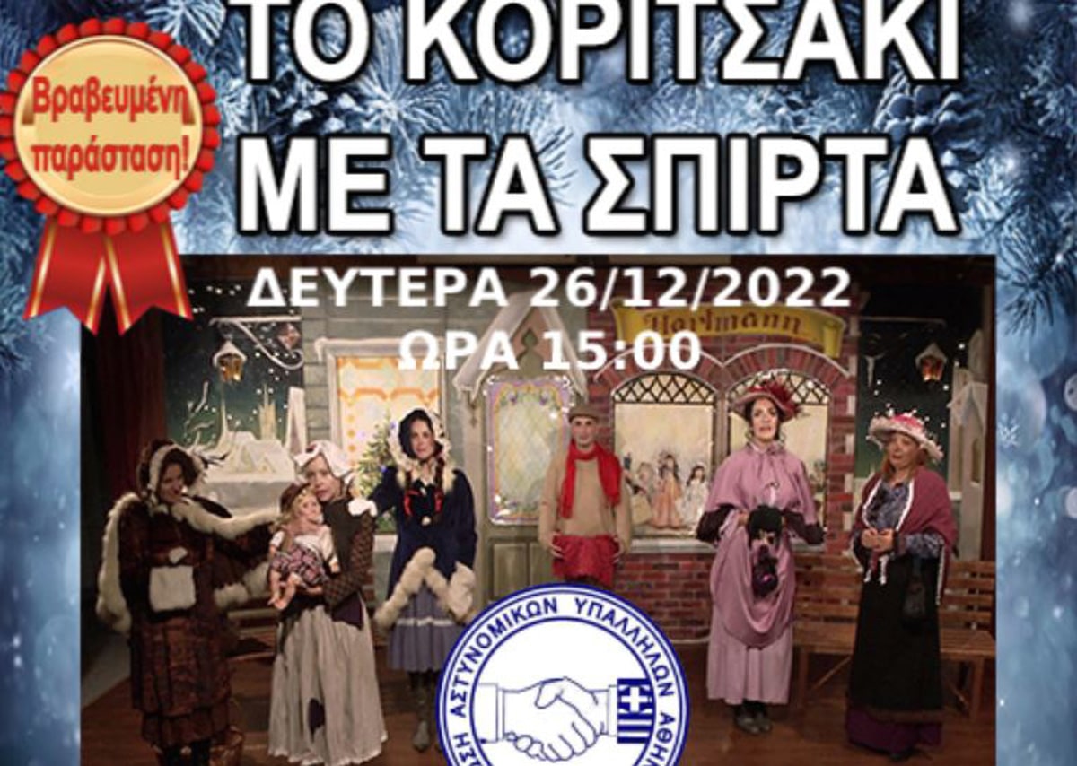 H Ένωση Αστυνομικών Υπαλλήλων Αθηνών (ΕΑΣΥΑ) διοργανώνει δωρεάν για τα παιδιά των μελών της, την παιδική θεατρική παράσταση «Το κοριτσάκι με τα σπίρτα», τη Δευτέρα 26 Δεκεμβρίου 2022 και ώρα 15:00, στο Θέατρο Θυμέλη Έλλης Βοζικιάδου, οδός Μοσχονησίων 32, Πλ. Αμερικής.