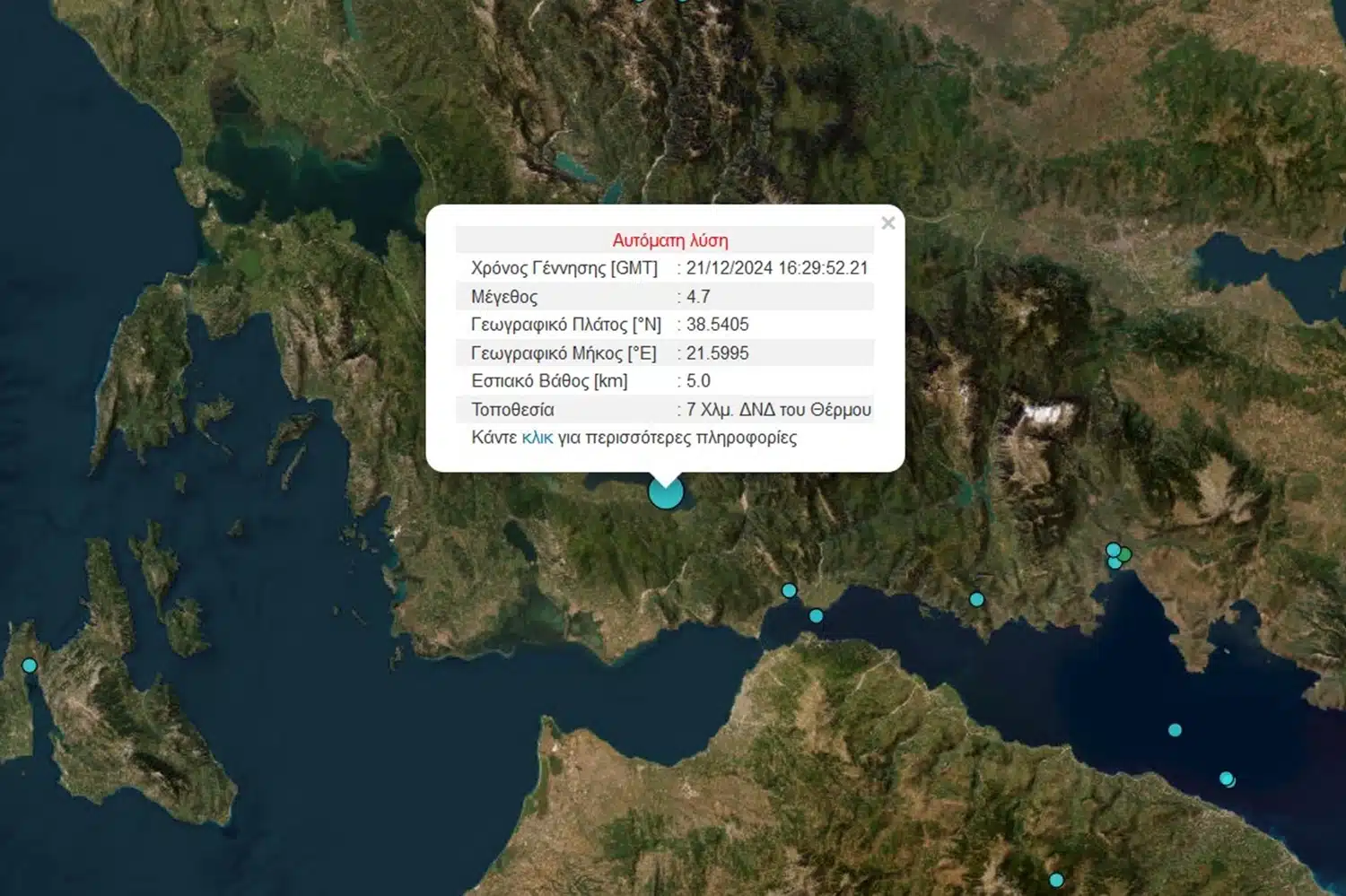 Σύμφωνα με το Γεωδυναμικό Ινστιτούτο, η δόνηση είναι μεγέθους 4,7 Ρίχτερ ενώ το επίκεντρο είναι 7 χιλιόμετρα Νοτιοδυτικά του Θέρμου.