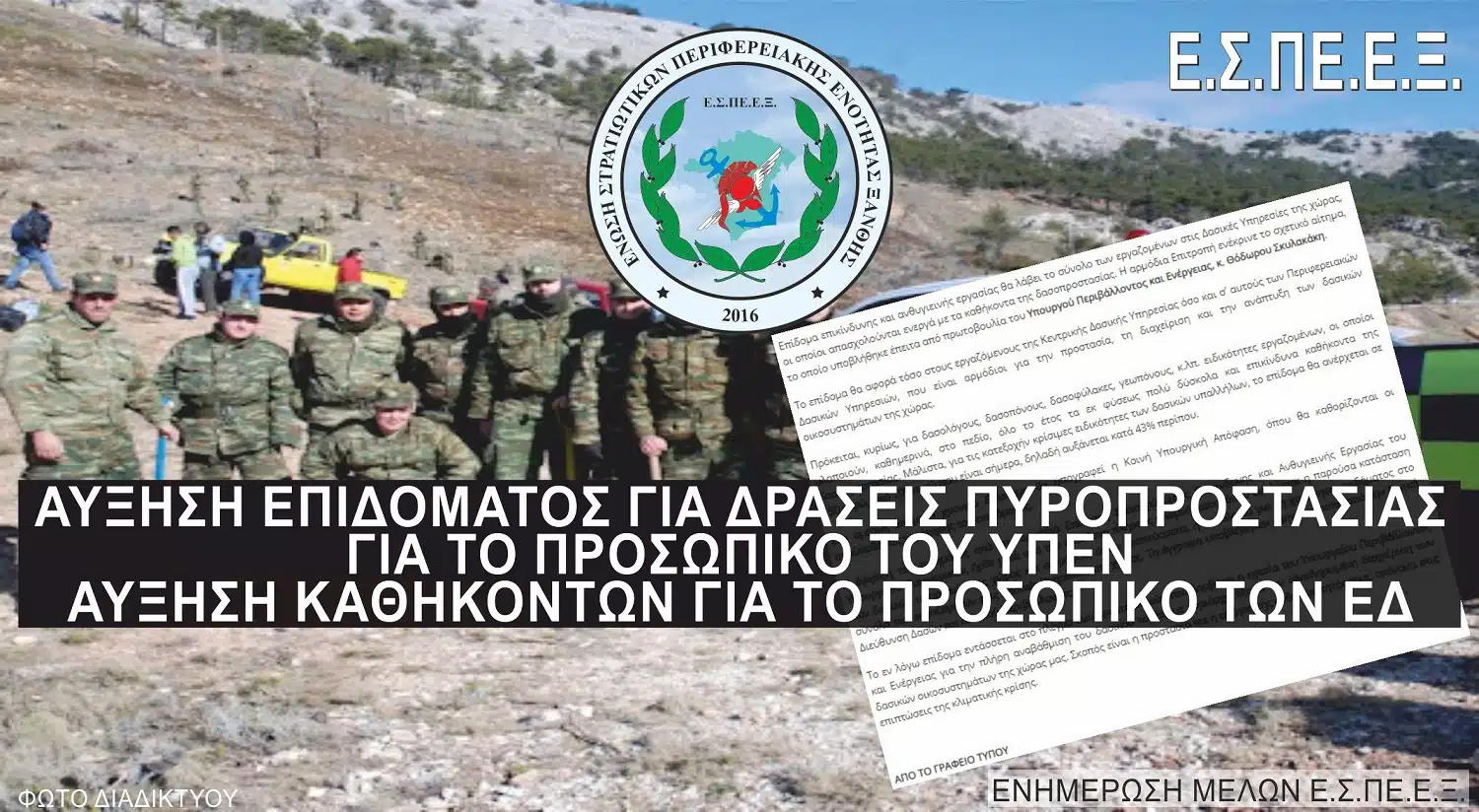 Κατόπιν των παραπάνω, εμμένοντας στην πάγια και δίκαιη θέση μας, όχι μόνο για τα συμφέροντα των στρατιωτικών, αλλά και ολόκληρου του ελληνικού λαού, για ενίσχυση των αρμόδιων υπουργείων με προσωπικό, υλικά και μέσα για την ουσιαστική, ποιοτική, αποτελεσματική και υπεύθυνη πολιτική προστασία, απαιτούμε την απεμπλοκή του προσωπικού των Ενόπλων Δυνάμεων από αυτές τις δράσεις, επιτρέποντάς το να ασχοληθεί αποκλειστικά και ανεπηρέαστα με τα στρατιωτικά του καθήκοντα. Μέχρι την πλήρη απεμπλοκή του, διεκδικούμε την ισότιμη οικονομική και εργασιακή του αντιμετώπιση με το καθ’ ύλην αρμόδιο προσωπικό. Σεβασμός στο ωράριο εργασίας, χορήγηση κατάλληλων μέσων ατομικής προστασίας, χρήση σύγχρονων και κατάλληλων οχημάτων, ολοκληρωμένη εκπαίδευση επί της αναληφθείσας αποστολής.