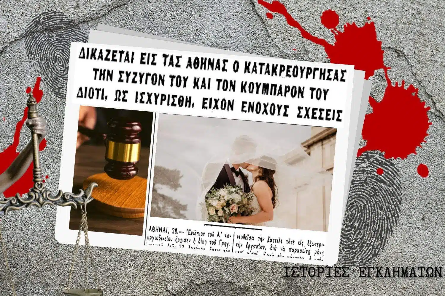 Στο εδώλιο του δικαστηρίου κάθισε ένας 32χρονος άνδρας, ο οποίος κατακρεούργησε τη νεαρή σύζυγό του και τον κουμπάρο τους, διότι πίστευε πως διατηρούσαν ερωτικό δεσμό. Το στυγερό έγκλημα αλλά και τη δίκη που ακολούθησε είχαν «αποτυπώσει» οι εφημερίδες της εποχής σε εκτενή δημοσιεύματά τους.