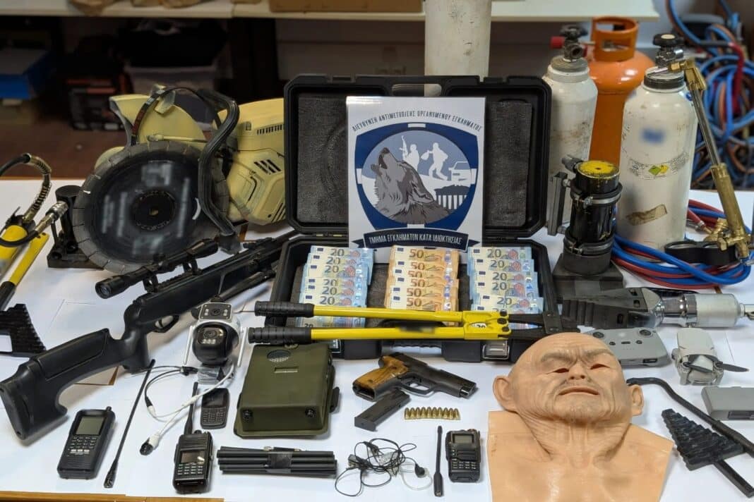 Κατασχέθηκαν, μεταξύ άλλων, πιστόλι, αεροβόλο τυφέκιο, αναδιπλούμενο μαχαίρι, φιάλες οξυγόνου, βαριοπούλες και διάφορα διαρρηκτικά εργαλεία.