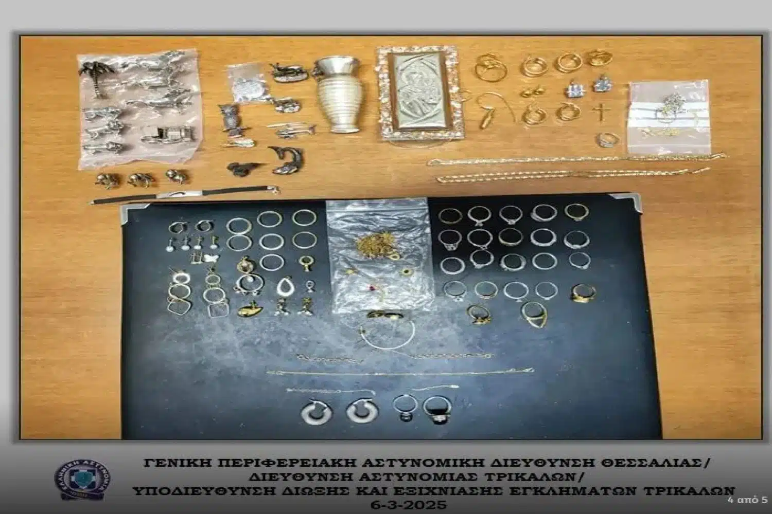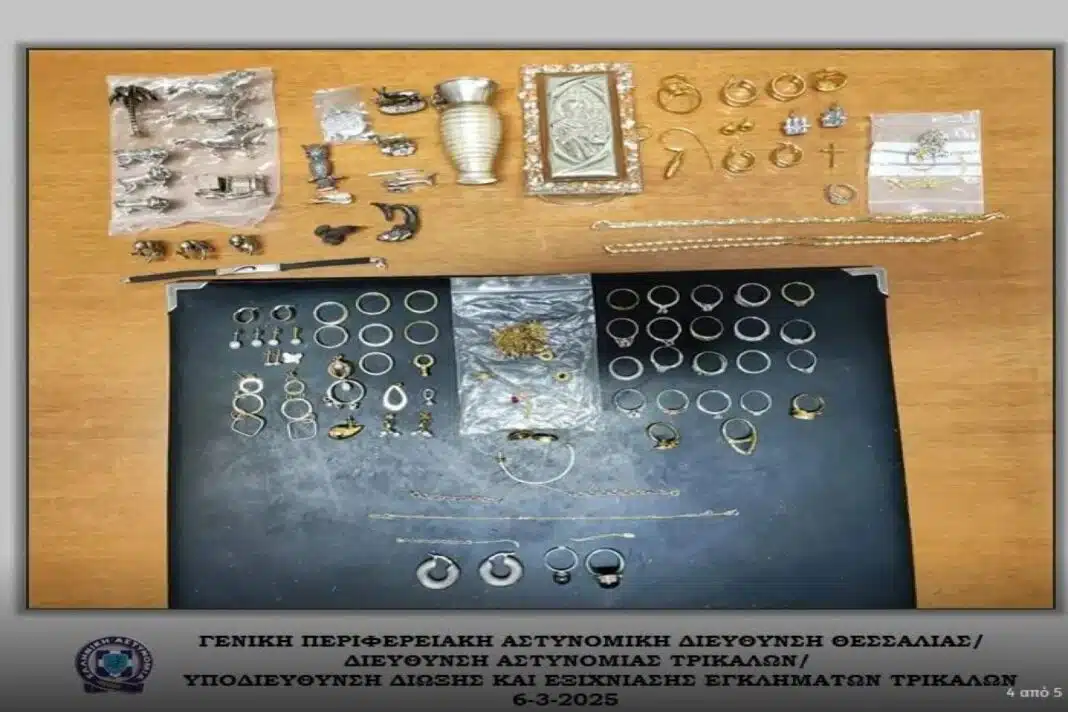 Εξακριβώθηκε, έπειτα από μεθοδική και συστηματική έρευνα της Υποδιεύθυνσης Δίωξης και Εξιχνίασης Εγκλημάτων Τρικάλων (ΕΛ.ΑΣ.), η δράση εγκληματικής ομάδας, η οποία δραστηριοποιούνταν στη διάπραξη κλοπών, κυρίως από κοσμηματοπωλεία, σε περιοχές της Θεσσαλίας, της Στερεάς Ελλάδας και της Πελοποννήσου.