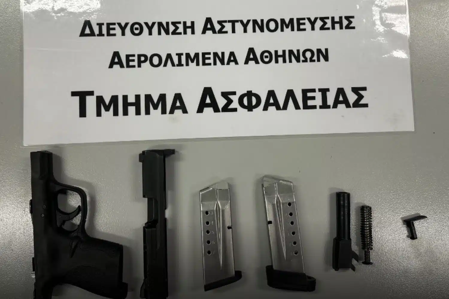 Κατά τον ακτινογραφικό έλεγχο των αποσκευών του από μηχάνημα X-ray, εντοπίστηκε και κατασχέθηκε αποσυναρμολογημένο πιστόλι καθώς και δύο γεμιστήρες, ενώ ανωτέρω αστυνομικοί συνέλαβαν τον 60χρονο επιβάτη.
