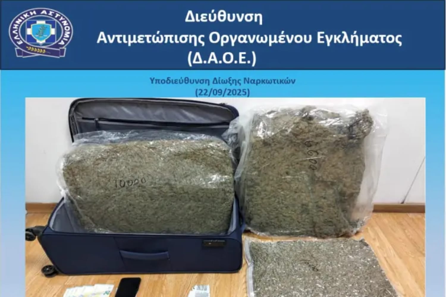 Στην περίπτωση του 25χρονου, ο νεαρός προερχόμενος από χώρα του εξωτερικού, κατελήφθη από αστυνομικούς του Τμήματος Δίωξης Ναρκωτικών Αερολιμένα Αθηνών, στον χώρο αφίξεων του αεροδρομίου, να έχει αποκρύψει εντός της αποσκευής του και να φέρει στην κατοχή του, με σκοπό την διακίνηση, 3 συσκευασίες, οι οποίες περιείχαν 18.200 γραμμάρια ακατέργαστης κάνναβης υδροπονικής καλλιέργειας.