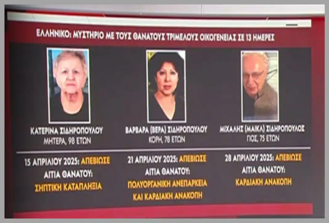 Συνεχίζονται οι έρευνες για το θρίλερ των τριών θανάτων στο Ελληνικό και στις τρεις σορούς θα γίνουν εργαστηριακές έρευνες για να φανεί αν θα βρεθούν δηλητήρια ή βαρέα μέταλλα, όπως το αρσενικό.