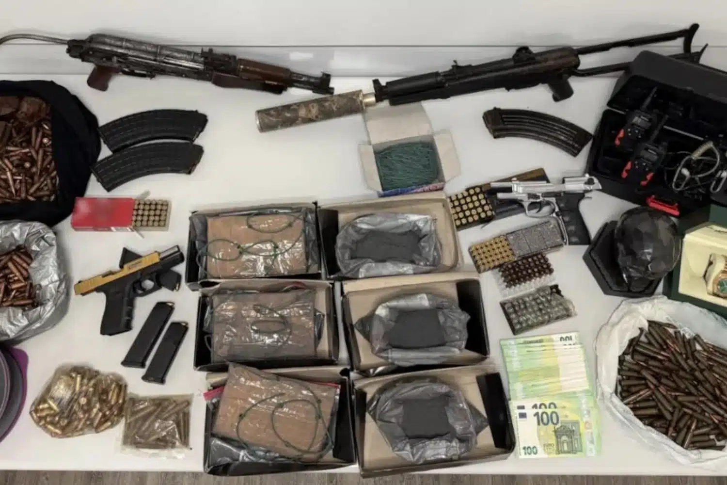 Ακολούθησαν έρευνες στις οικίες τους, όπου βρέθηκαν πιστόλια και πολεμικά τυφέκια, πλήθος φυσιγγίων, εκρηκτικές ύλες, βραδύκαυστα φυτίλια, πολυτελή ρολόγια και πλήθος κλειδιών αυτοκινήτων.