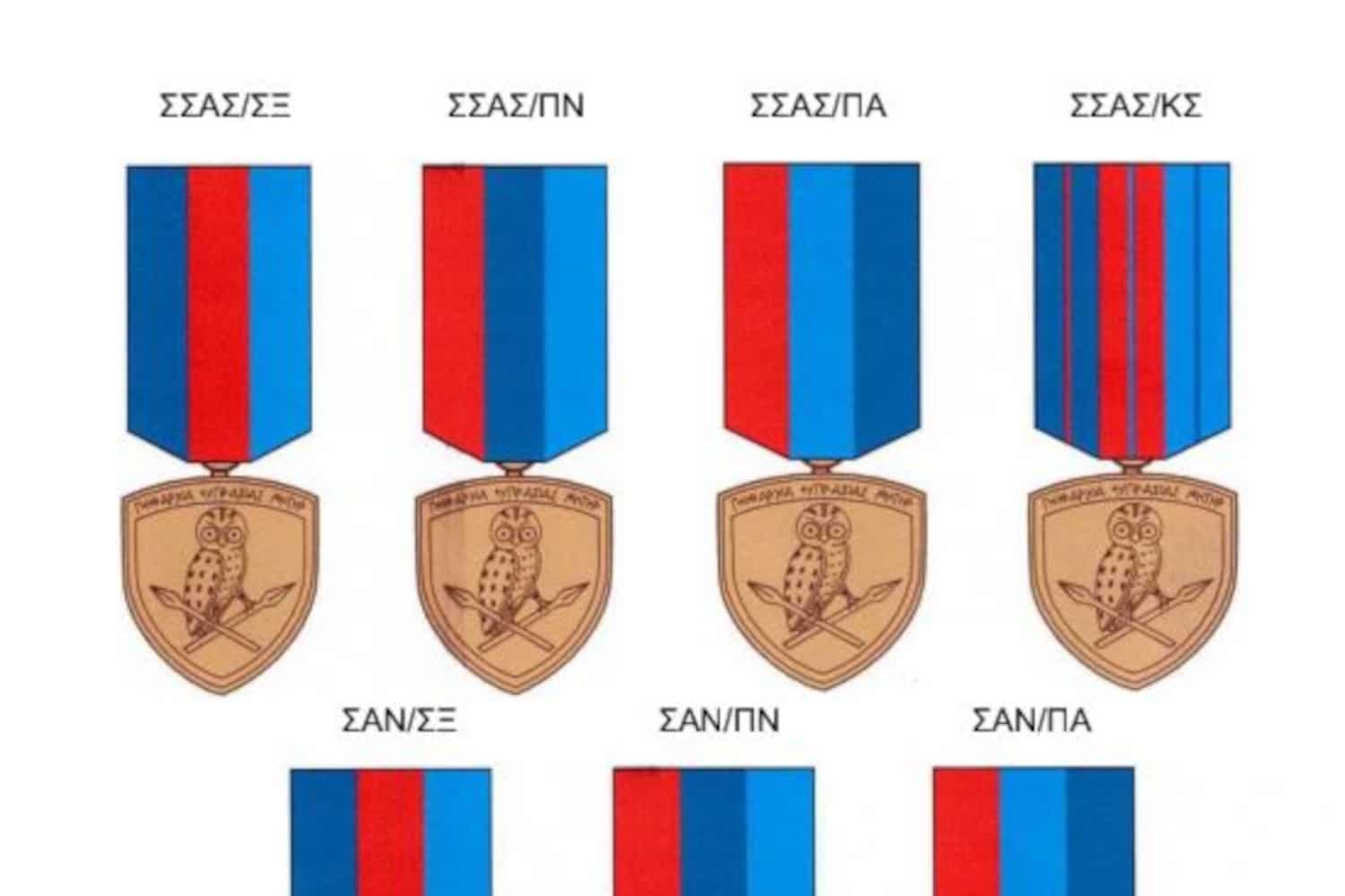 Πολεμική Αεροπορία: ερυθρό – ανοιχτό κυανό – βαθύ κυανό