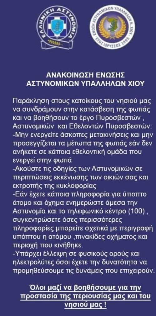 Με ανακοίνωσή της η Ένωση Αστυνομικών Χίου παρακαλεί τους κατοίκους του νησιού να συνδράμουν στην κατάσβεση της φωτιάς και να βοηθήσουν το έργο Πυροσβεστών, Αστυνομικών και Εθελοντών Πυροσβεστών.