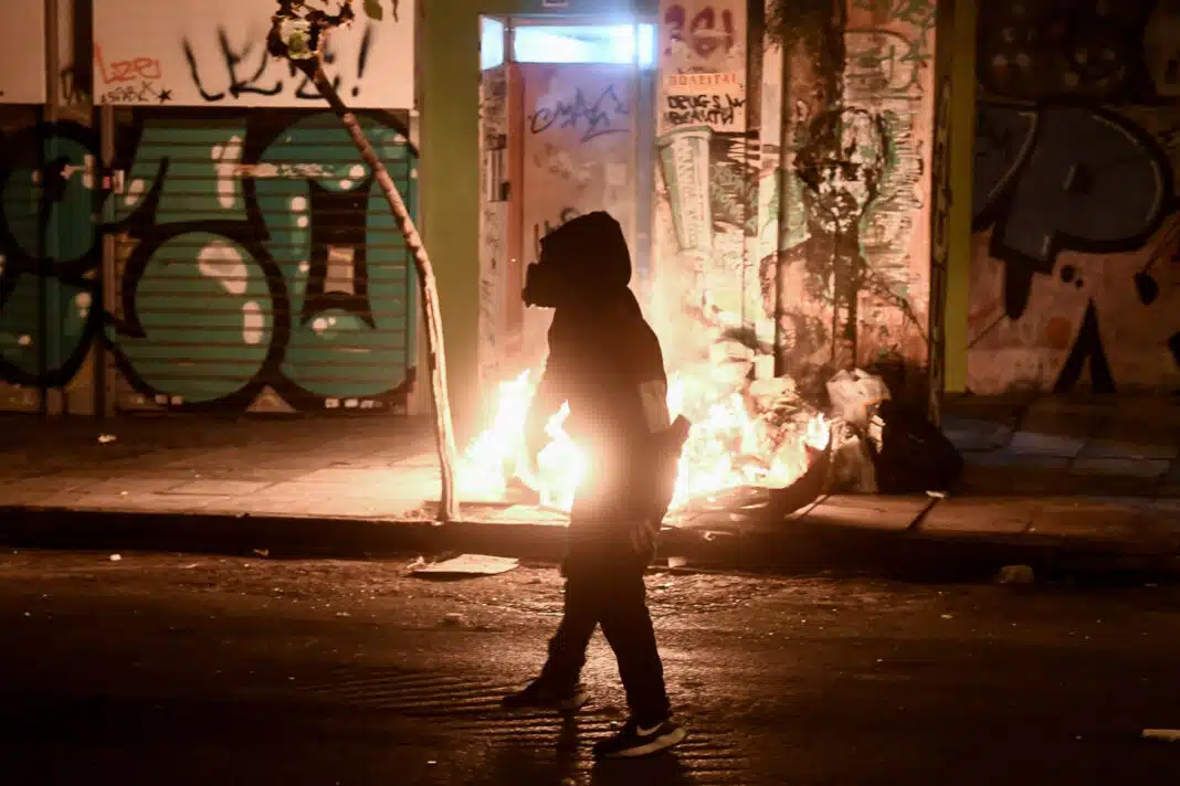 Από την επίθεση πήρε φωτιά και ένας κάδος απορριμμάτων, ενώ έγινε προσαγωγή ενός ατόμου.