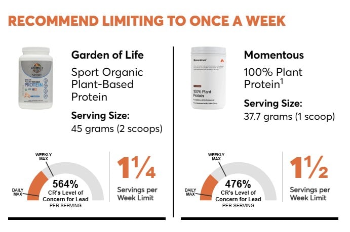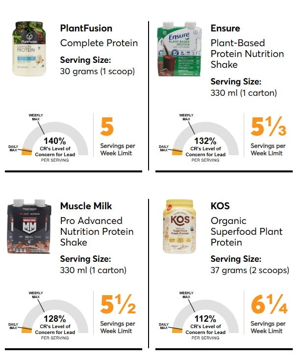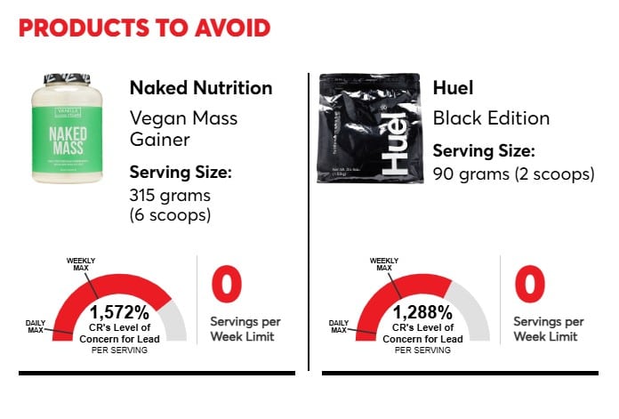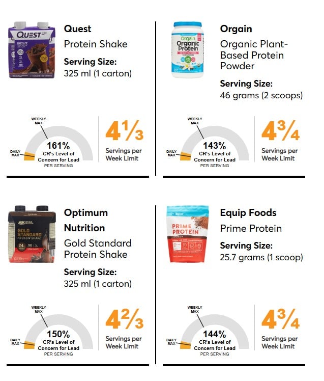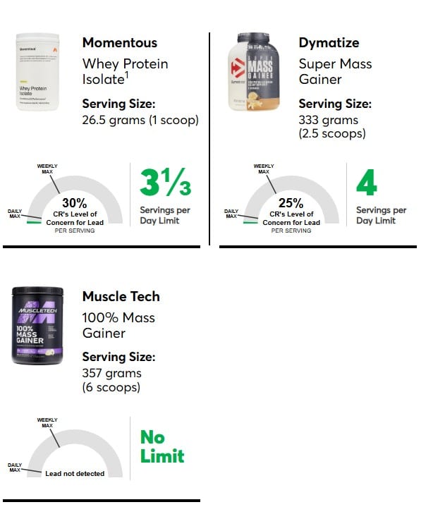 Από τις 23 διαφορετικές σκόνες πρωτεΐνης που εξετάστηκαν στο εργαστήριο, περισσότερες από δύο στις τρεις περιείχαν σε μία μόνο μερίδα περισσότερο μόλυβδο από το ημερήσιο ασφαλές όριο (0,5 μικρογραμμάρια), όπως αυτό έχει οριστεί για τον γενικό πληθυσμό.
